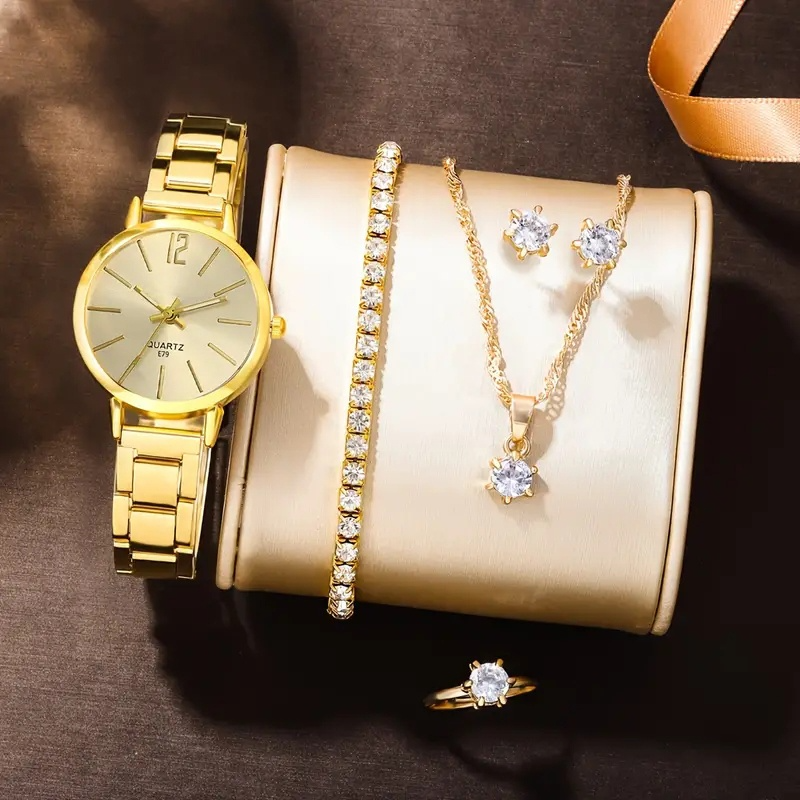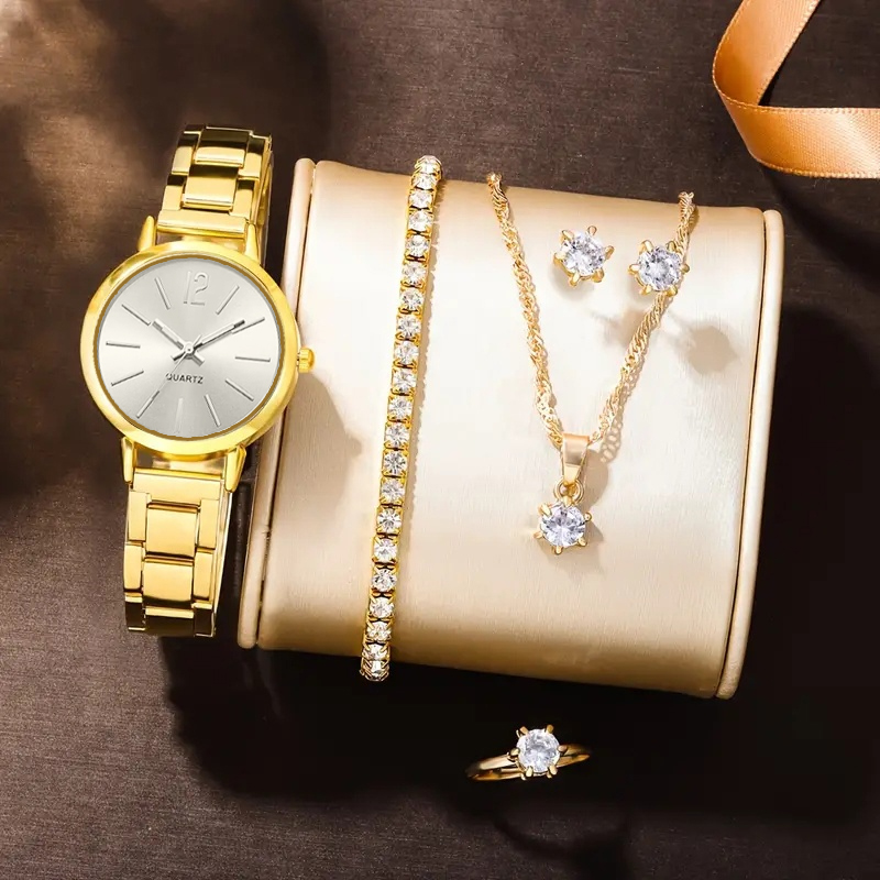 5-piece Women Watch Gift Set with Bracelet Necklace Earrings Ring Fashion Casual Goddess Wristwatch
