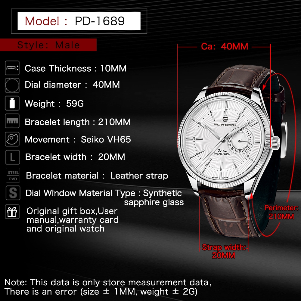 PAGANI DESIGN Men Watch Waterproof 200M Watches 40MM Dial Japan VH65 Sapphire Glass Fashion Stainless Steel Watch PD-1689