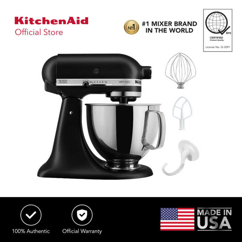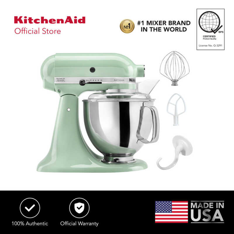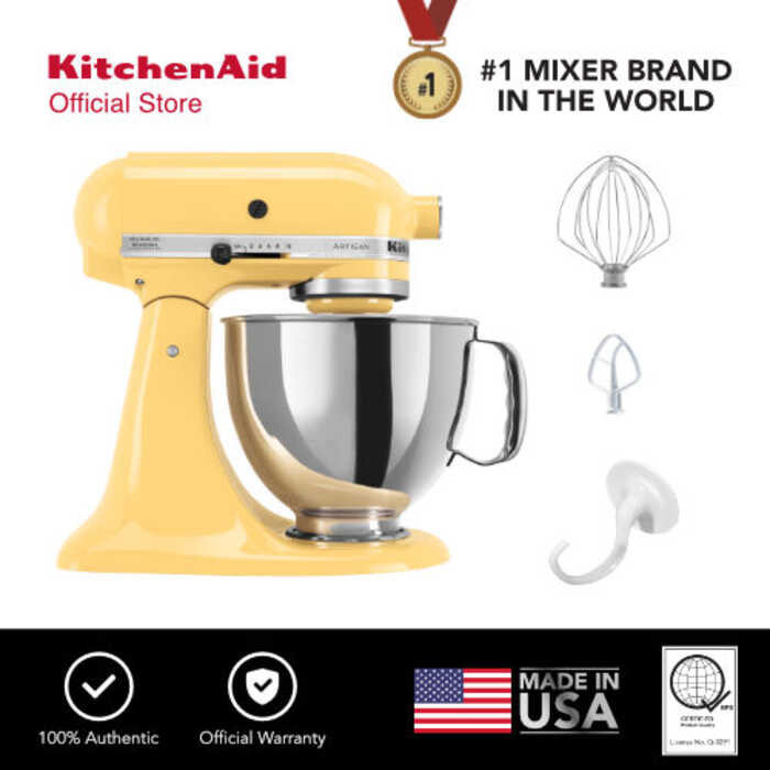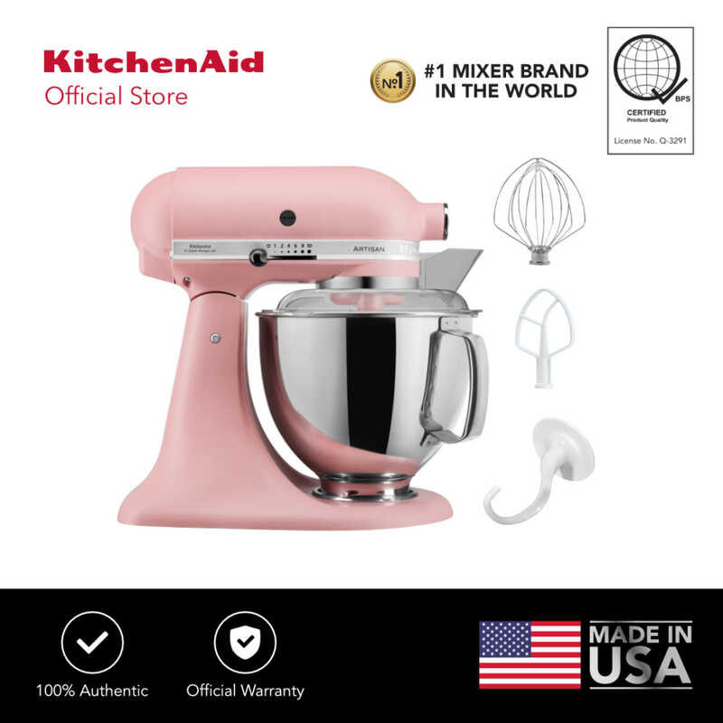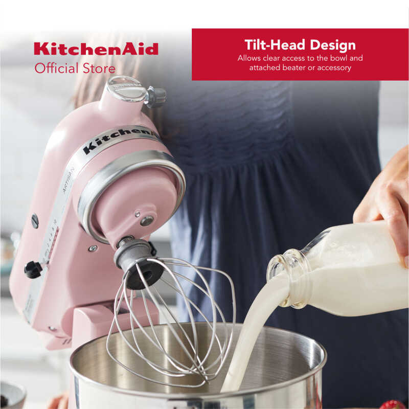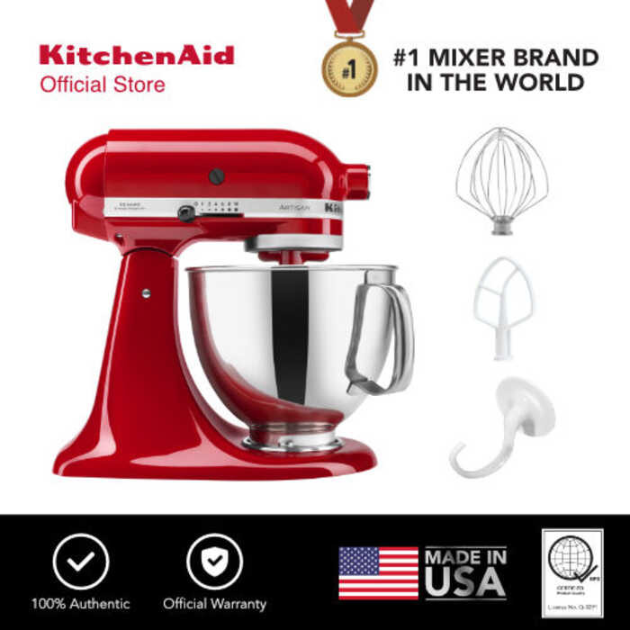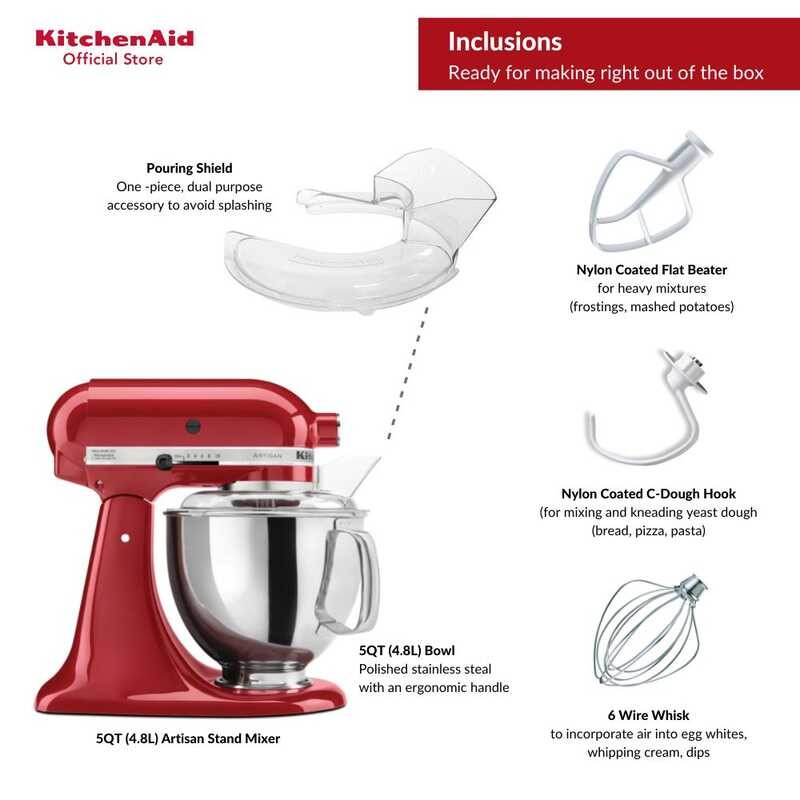 KitchenAid 5Qt Artisan Mixer 220V with Flat Beater, Coated Dough Hook, 6-Wire Whip, and Pouring