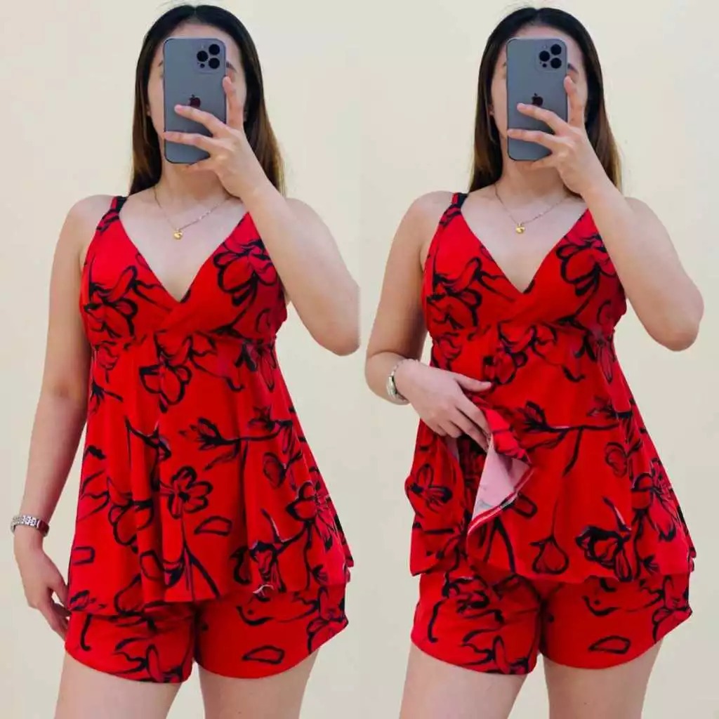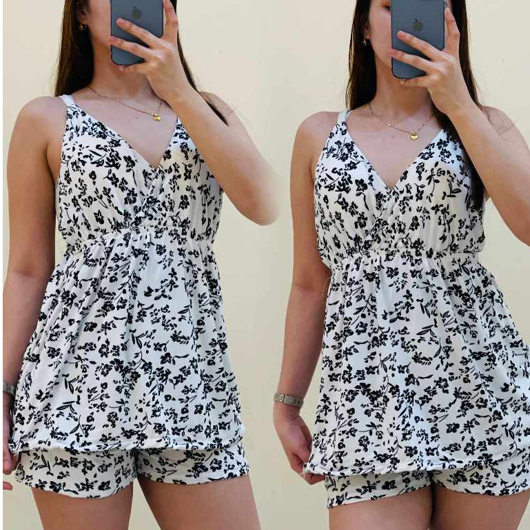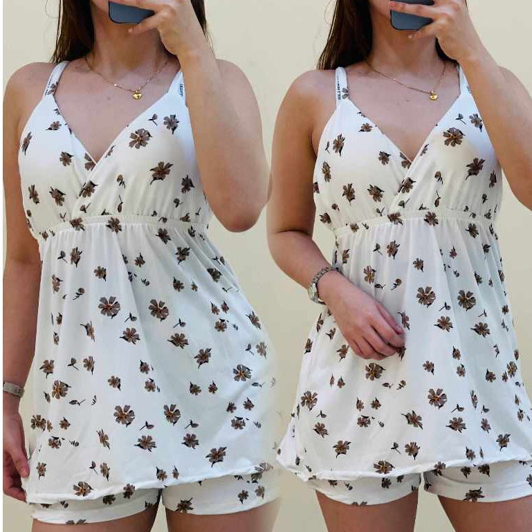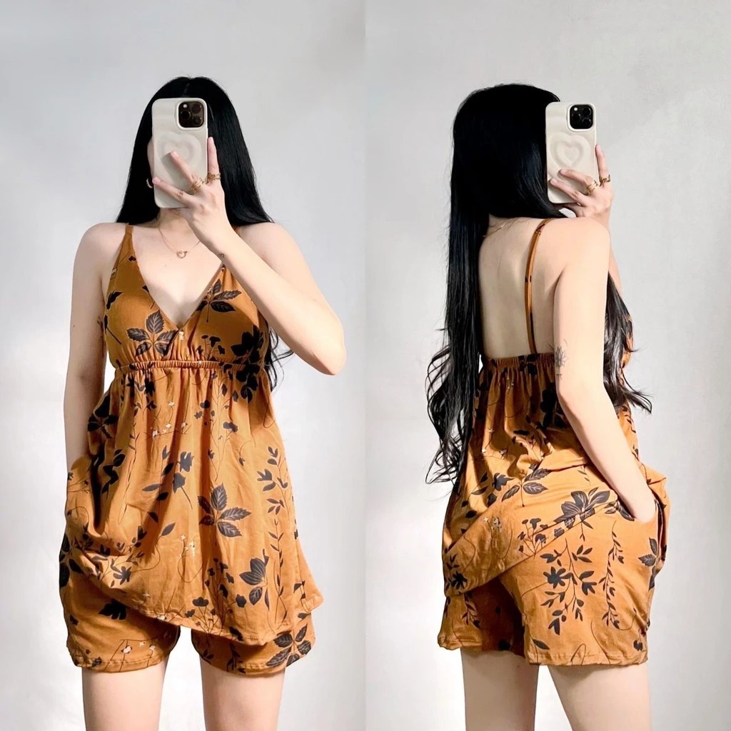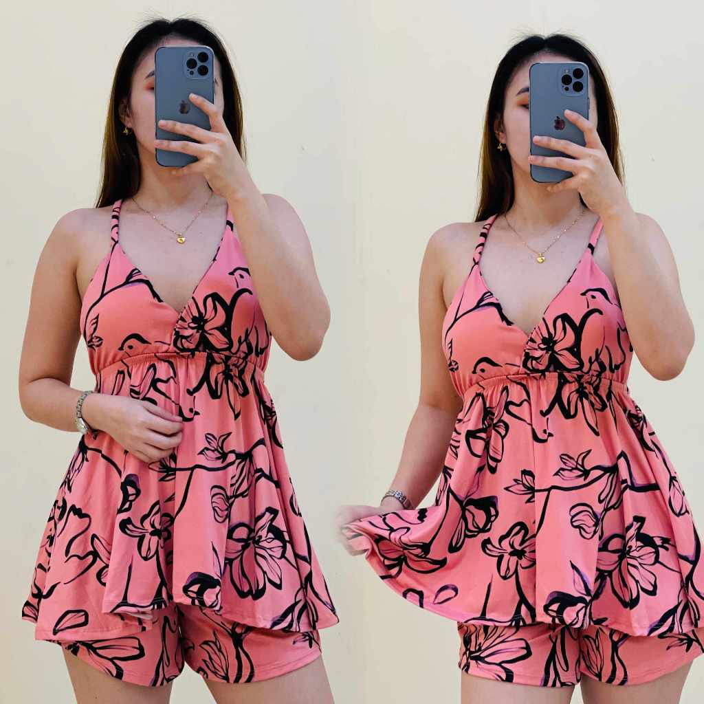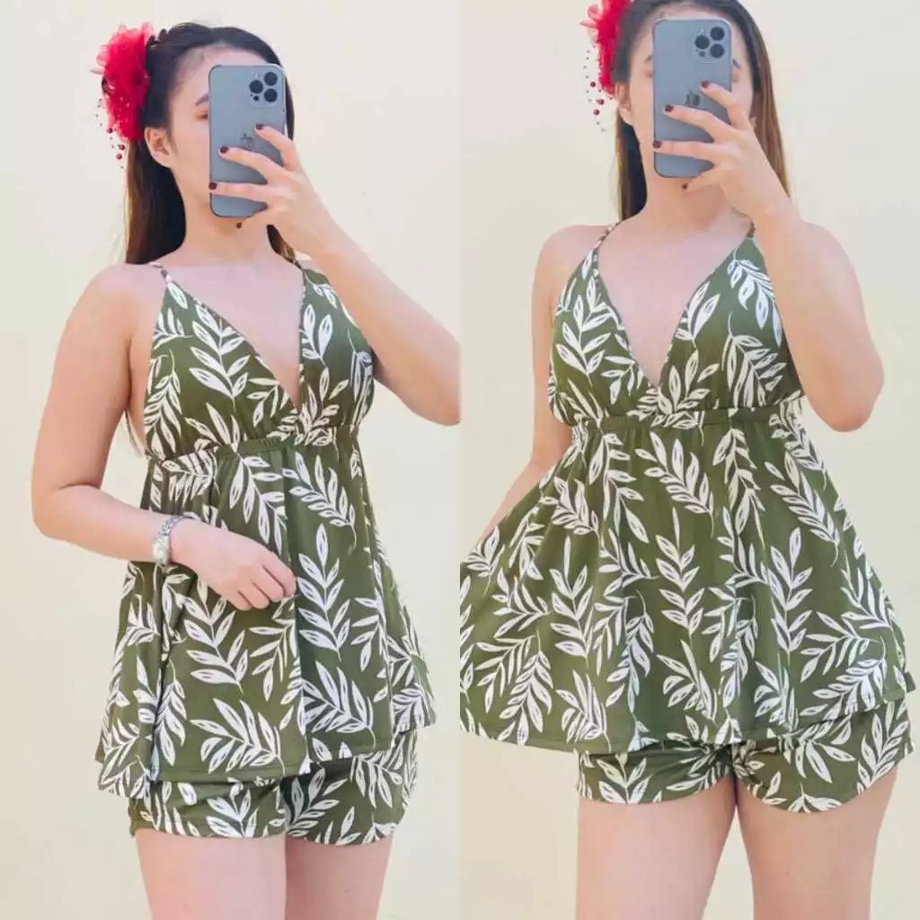 D&C-Cotton Spandex Terno Floral Spaghetti V-Neck With chest pad Top and Shor