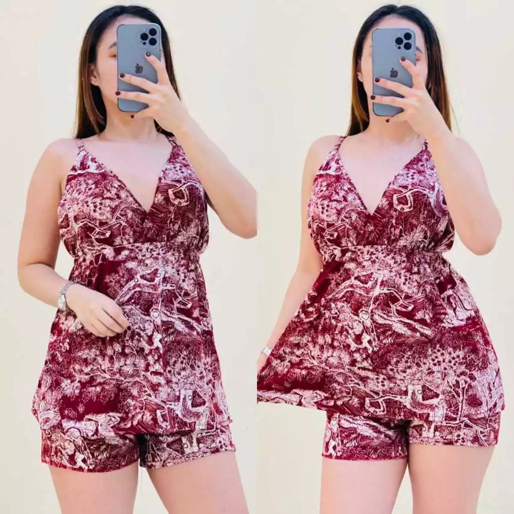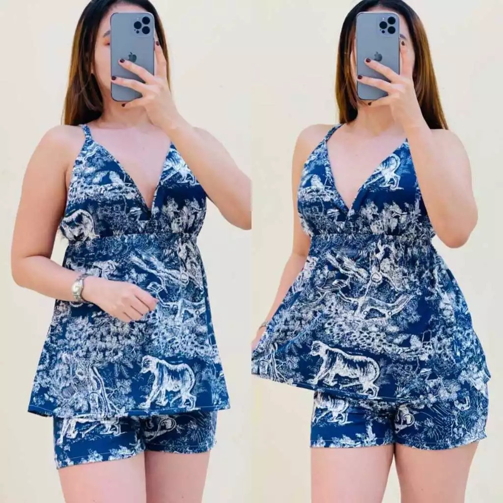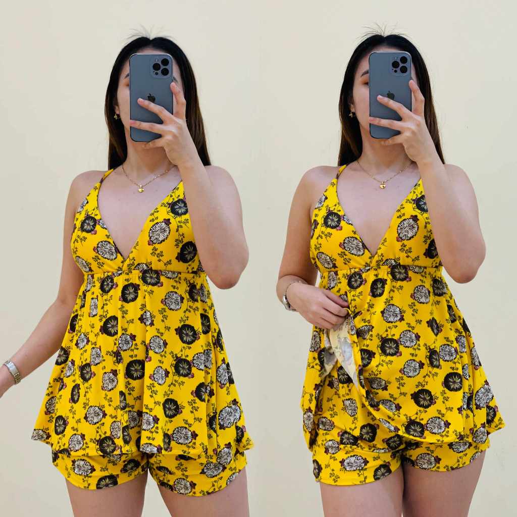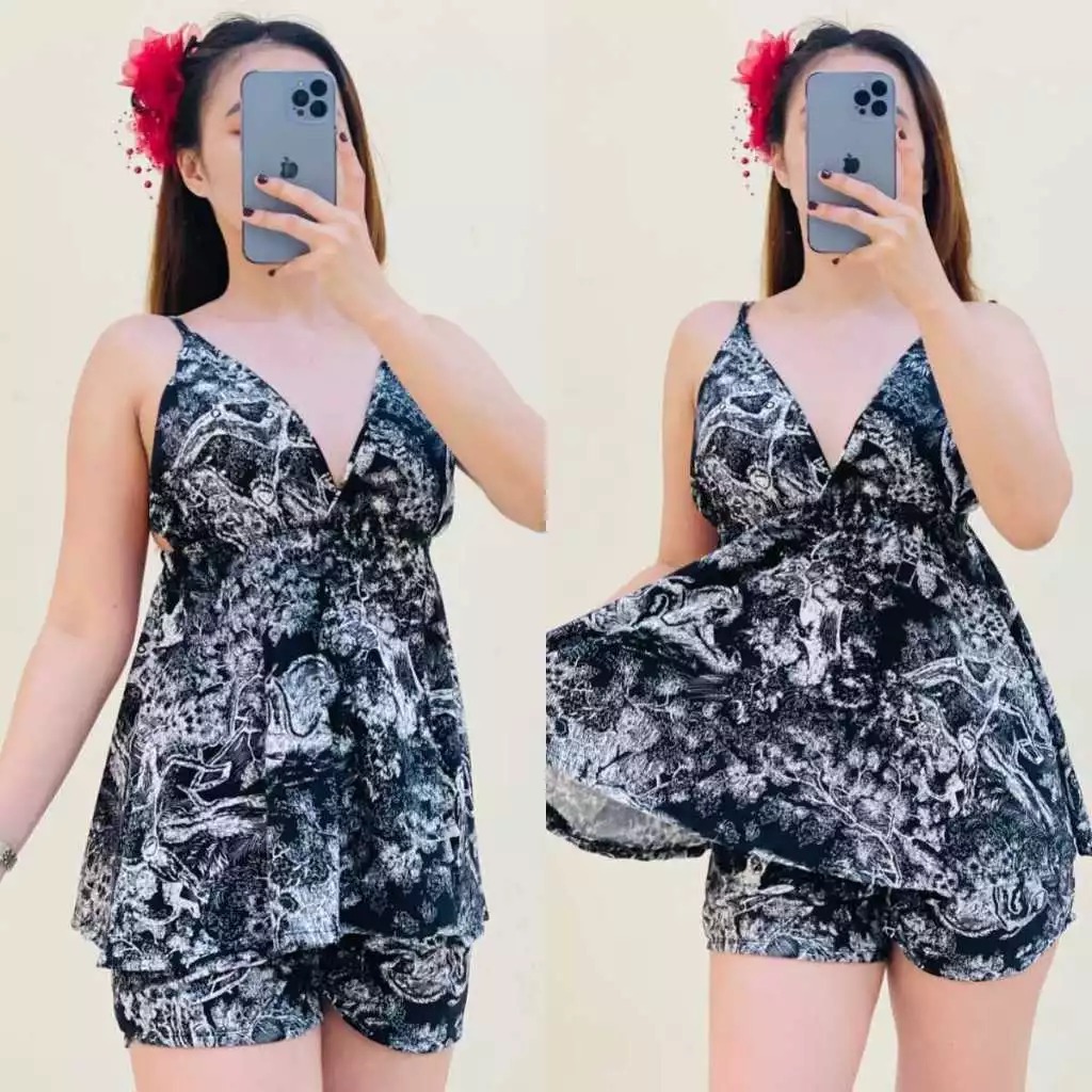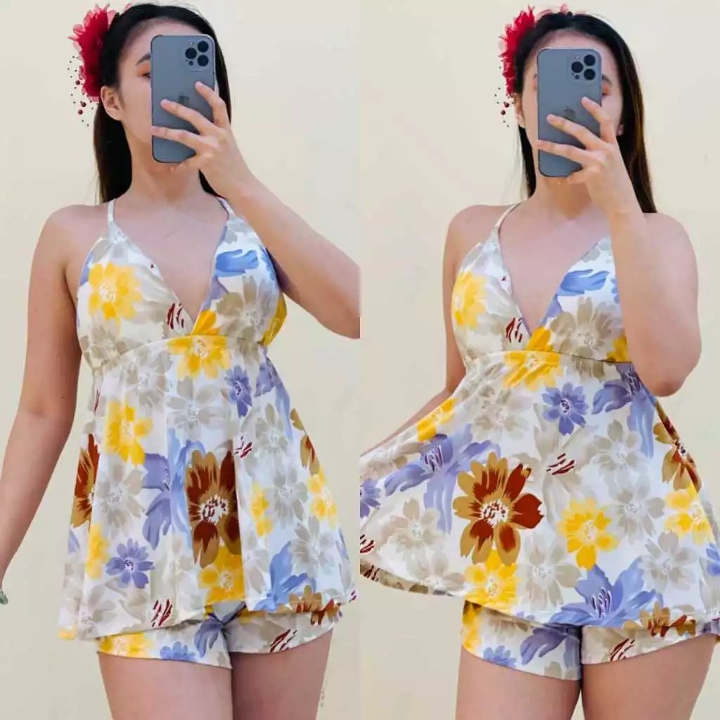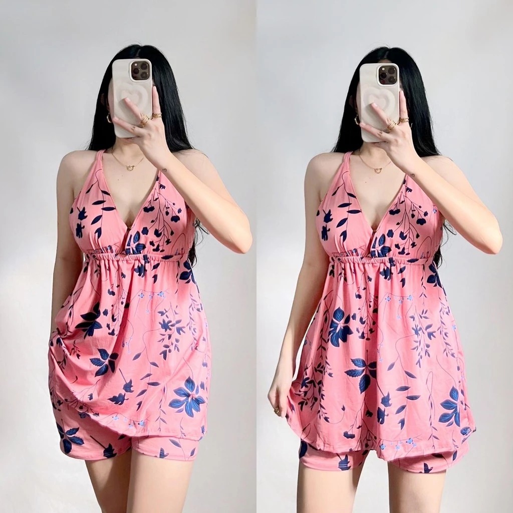 D&C-Cotton Spandex Terno Floral Spaghetti V-Neck With chest pad Top and Shor