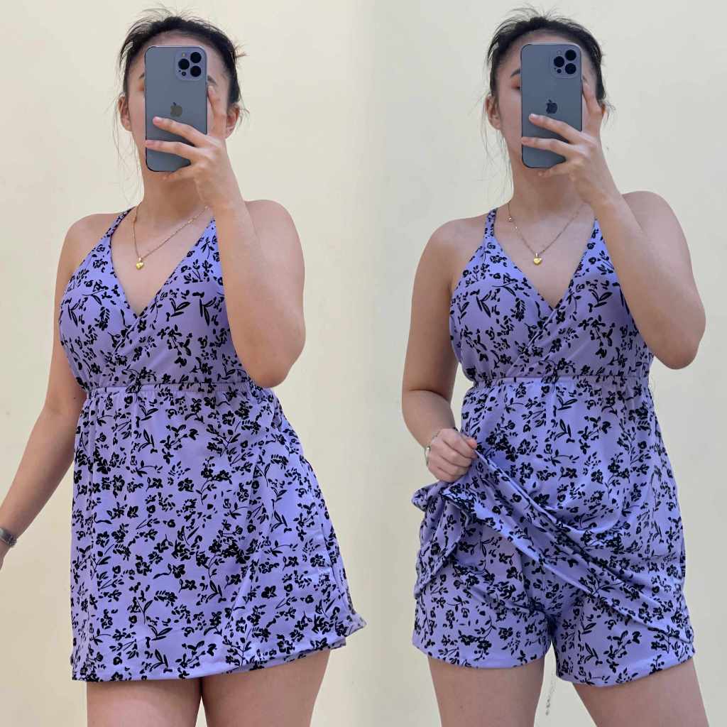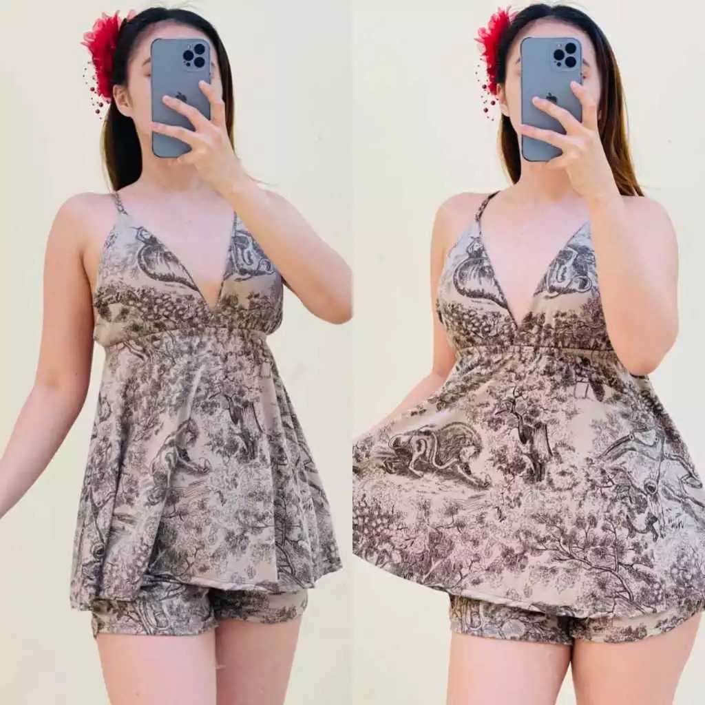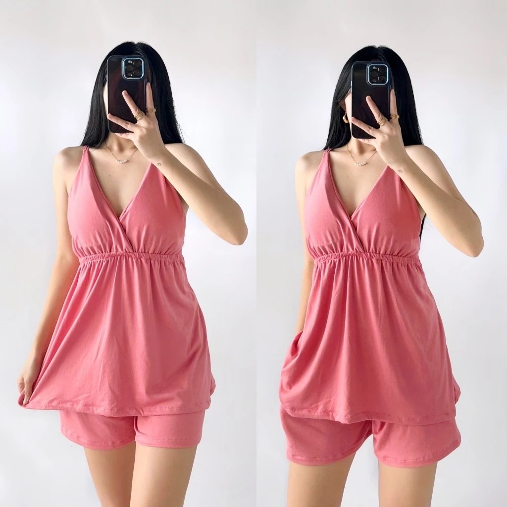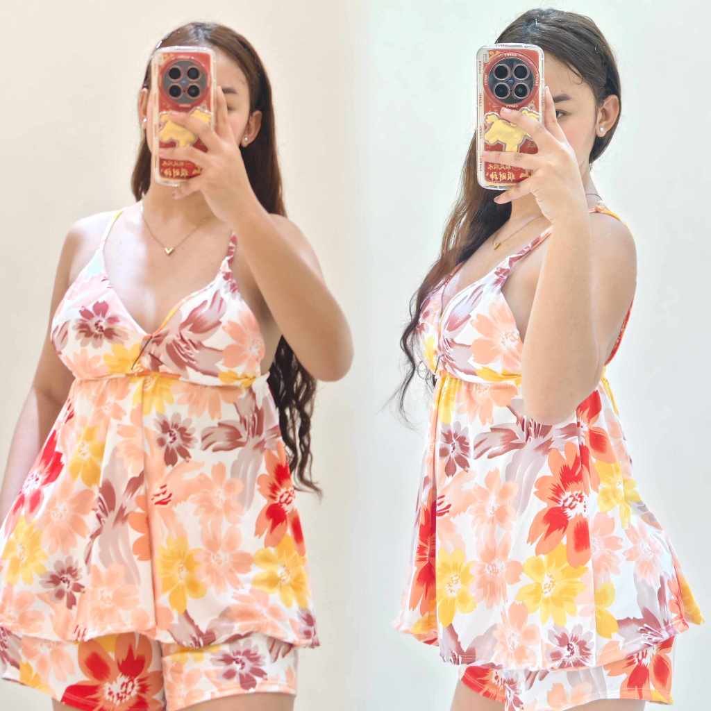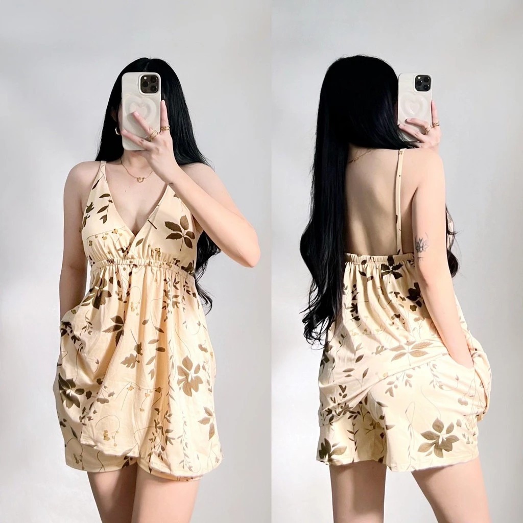 D&C-Cotton Spandex Terno Floral Spaghetti V-Neck With chest pad Top and Shor