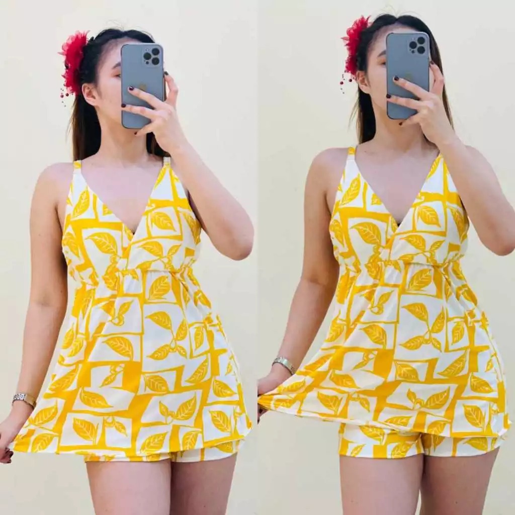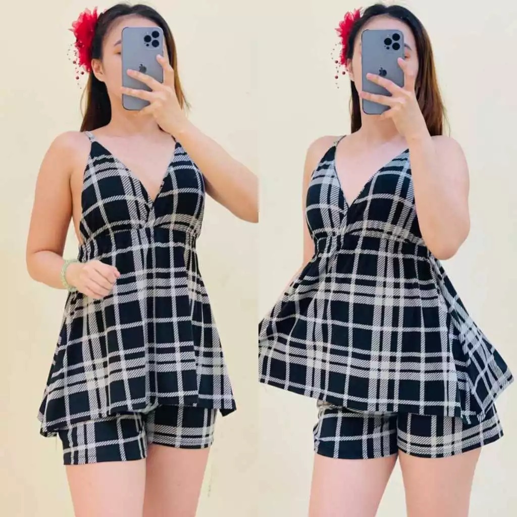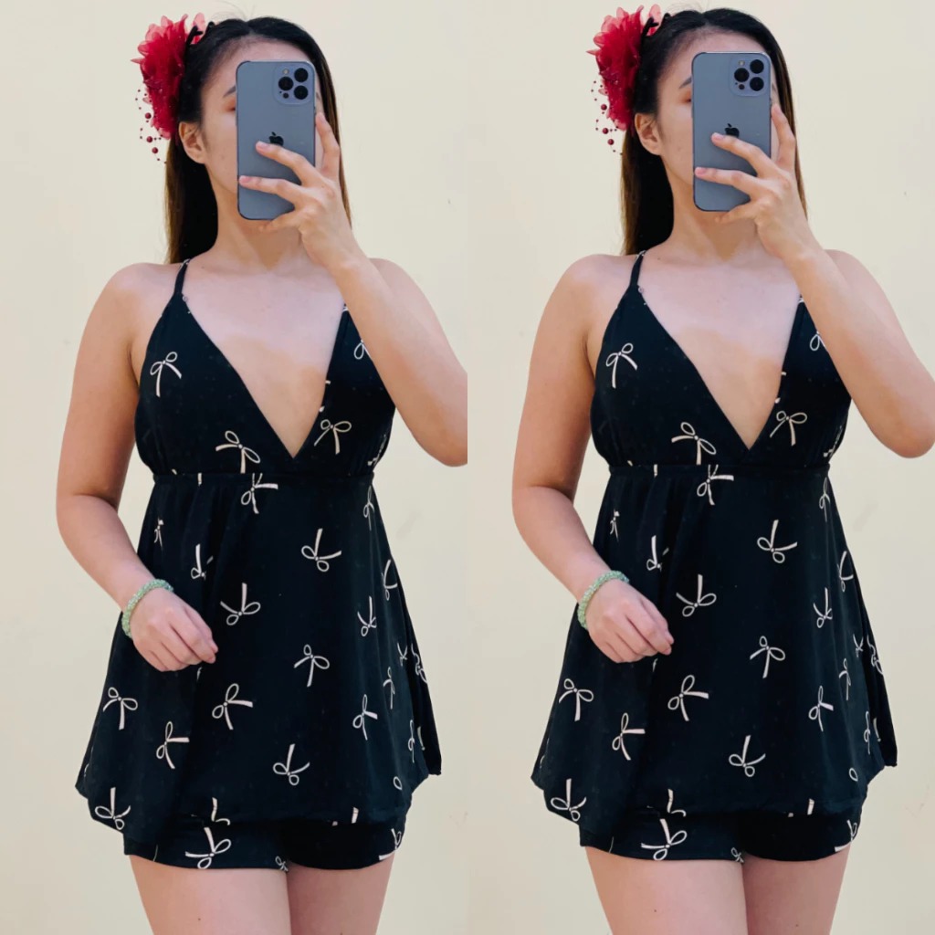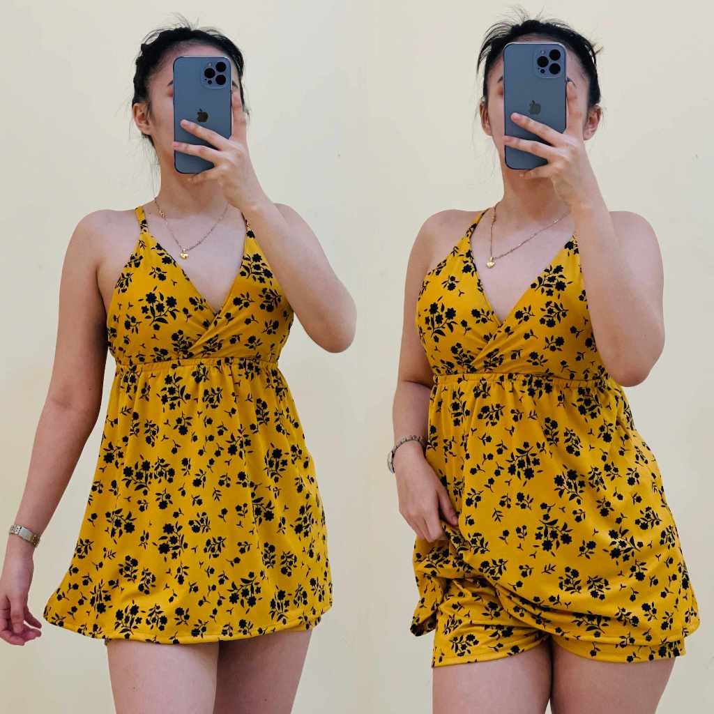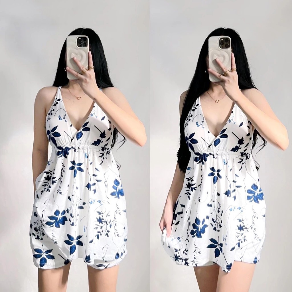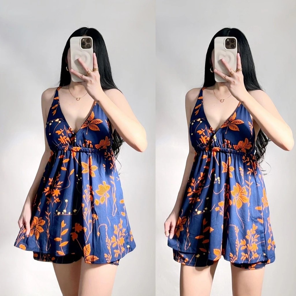D&C-Cotton Spandex Terno Floral Spaghetti V-Neck With chest pad Top and Shor