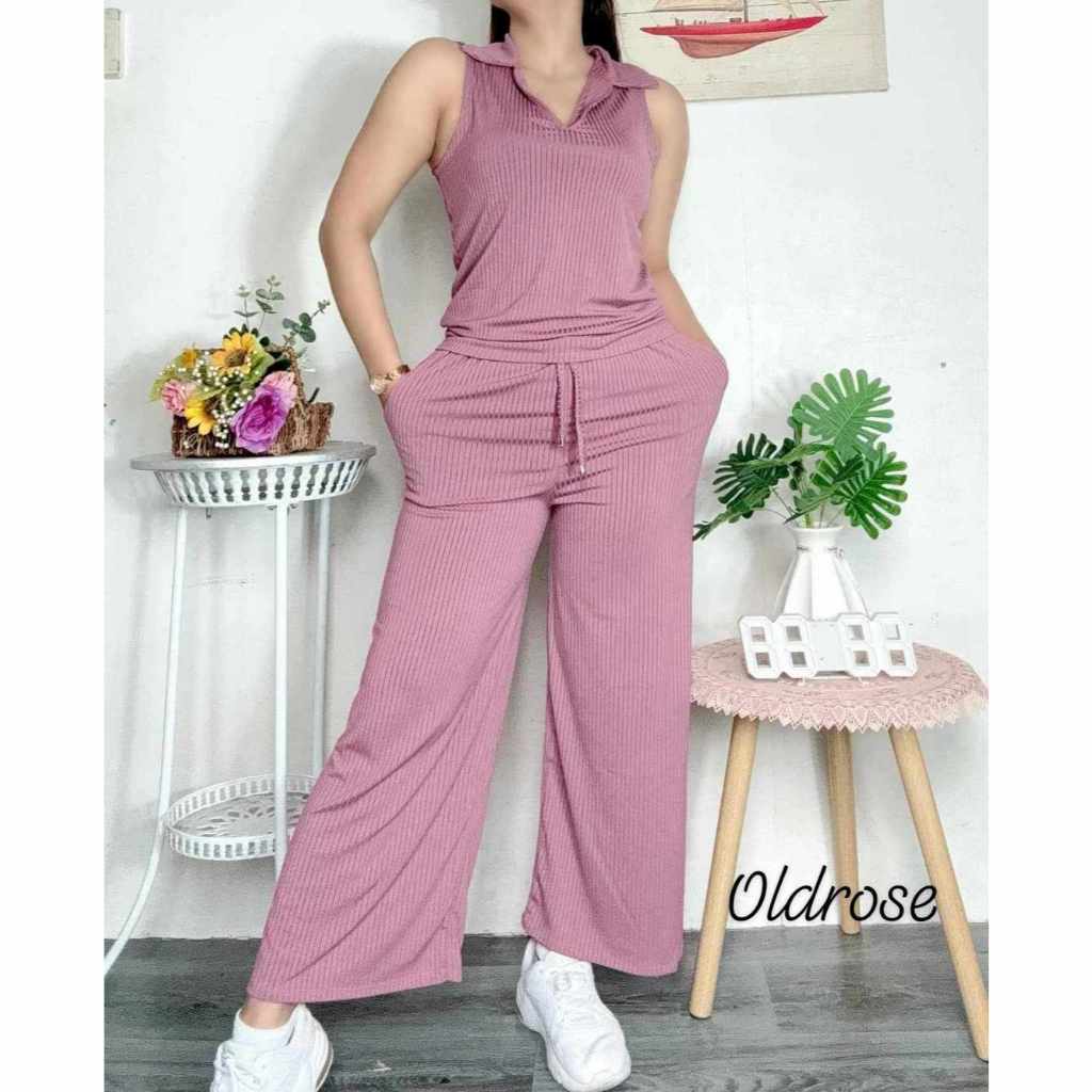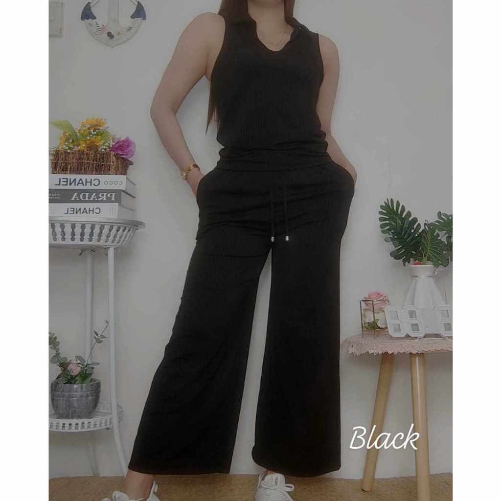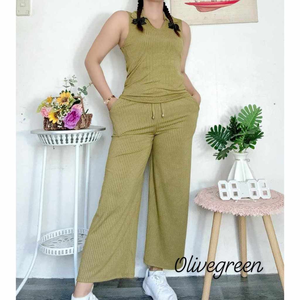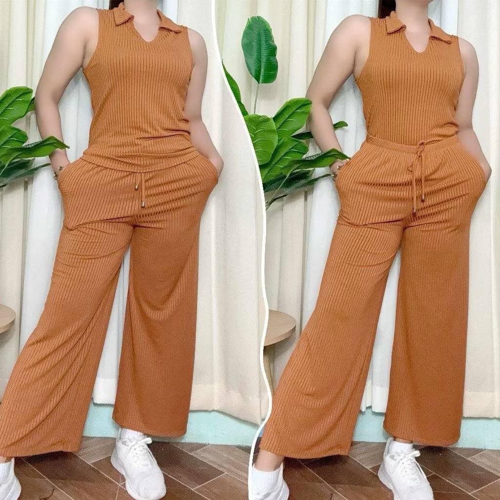 Cotton Knitted Women's Sando Collar Sleeveless and Squarepants Terno Set with 2 Side Pocket