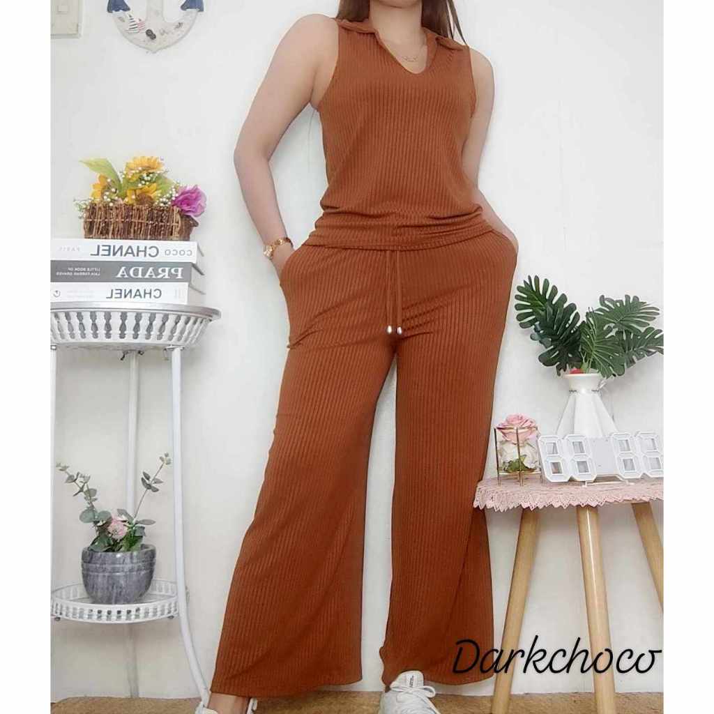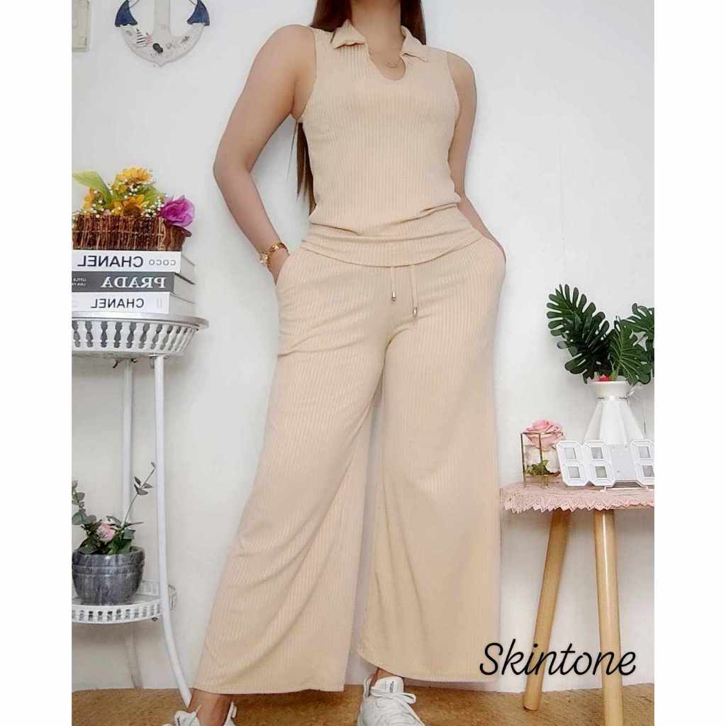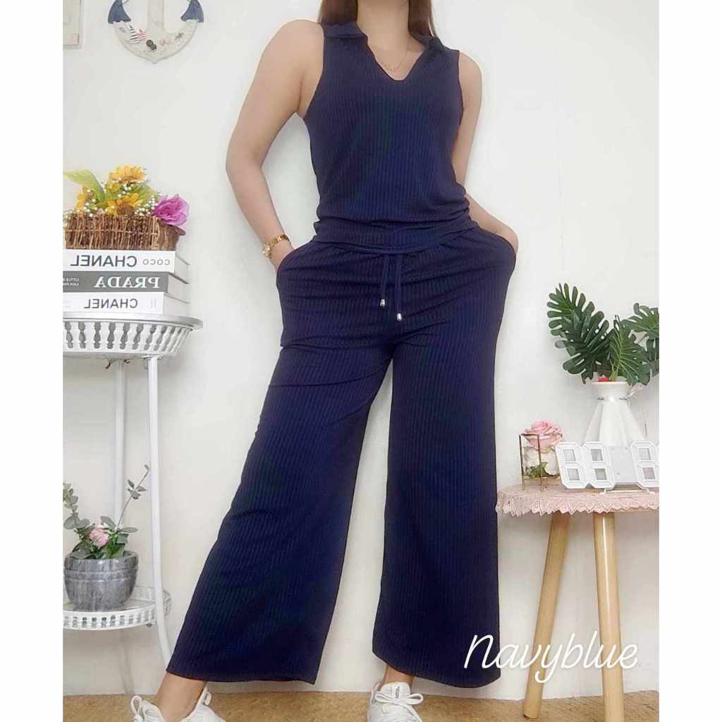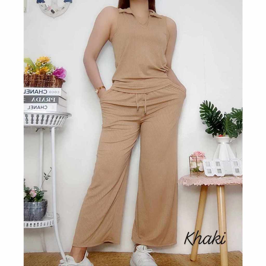 Cotton Knitted Women's Sando Collar Sleeveless and Squarepants Terno Set with 2 Side Pocket
