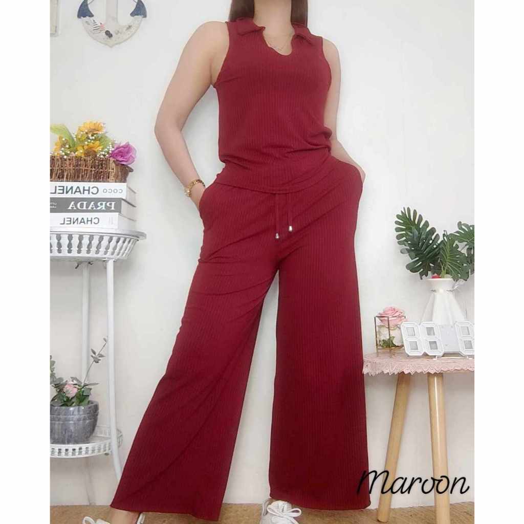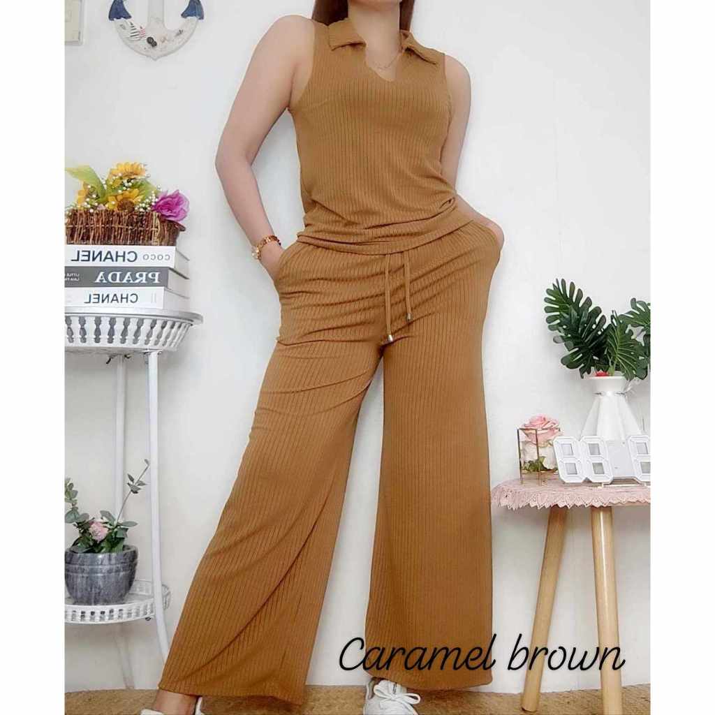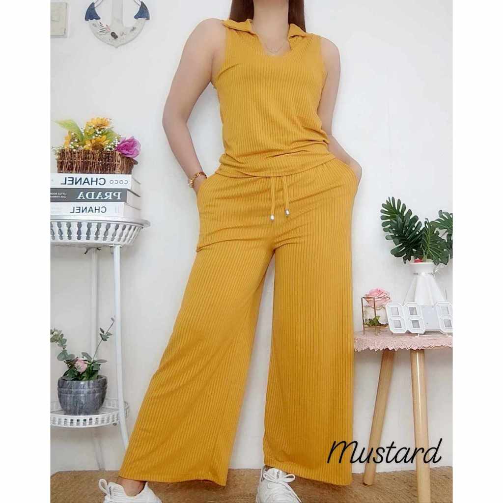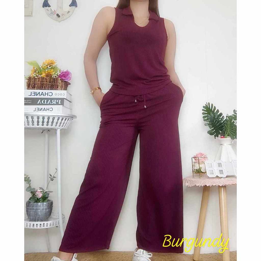 Cotton Knitted Women's Sando Collar Sleeveless and Squarepants Terno Set with 2 Side Pocket
