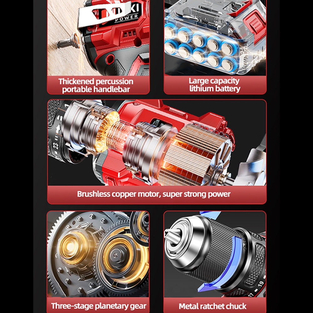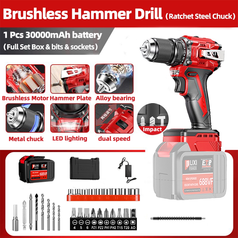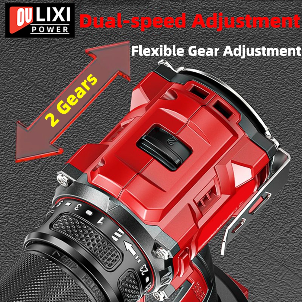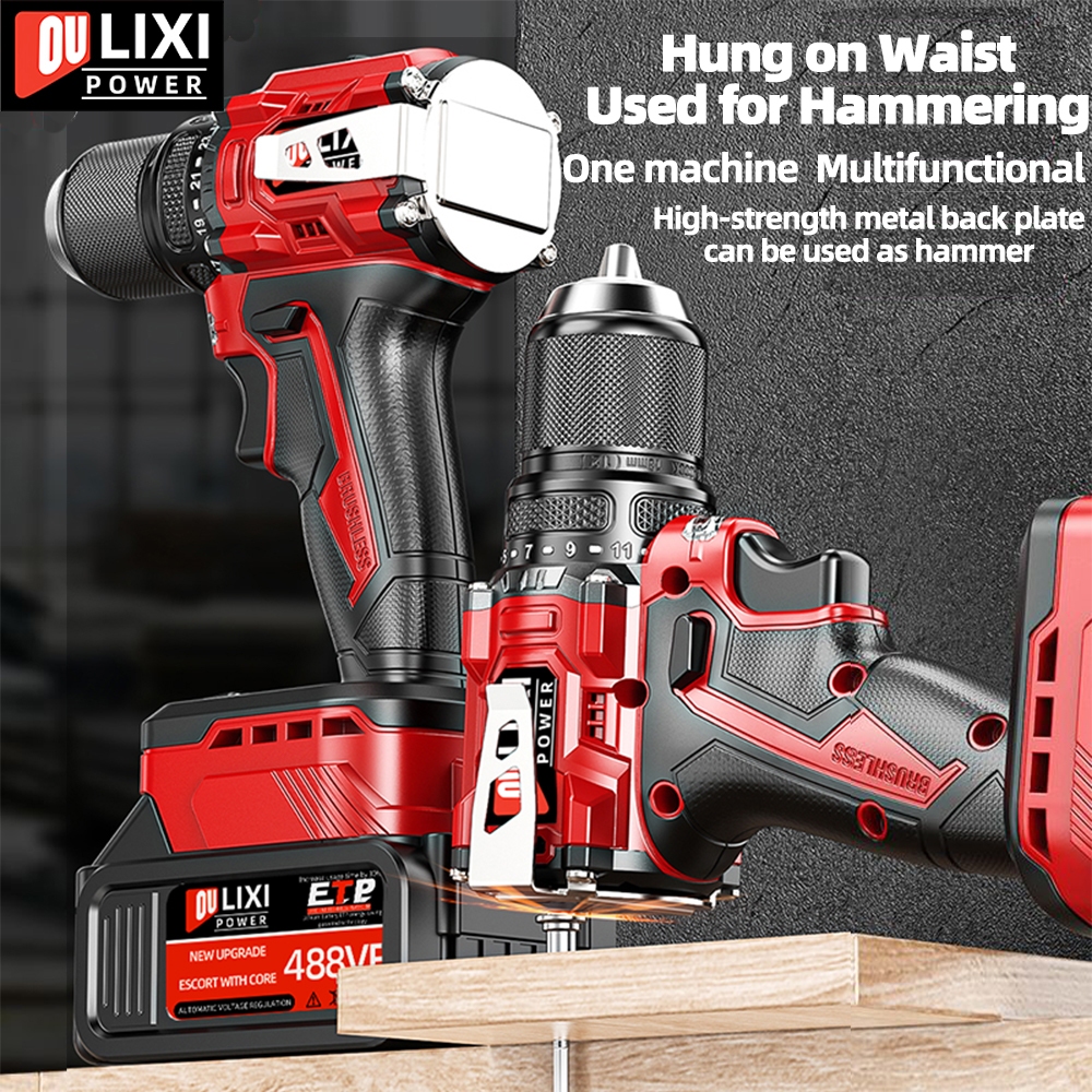 OULIXI Brushless Cordless Drill Impact Drill Screw Driver 21V Rechargeable Heavy Duty Wireless Electric Drill With High Hardness Metal Chunk and Full Set of Accessories