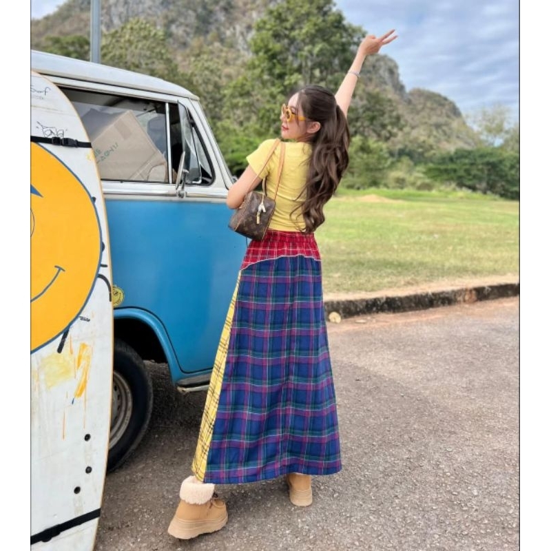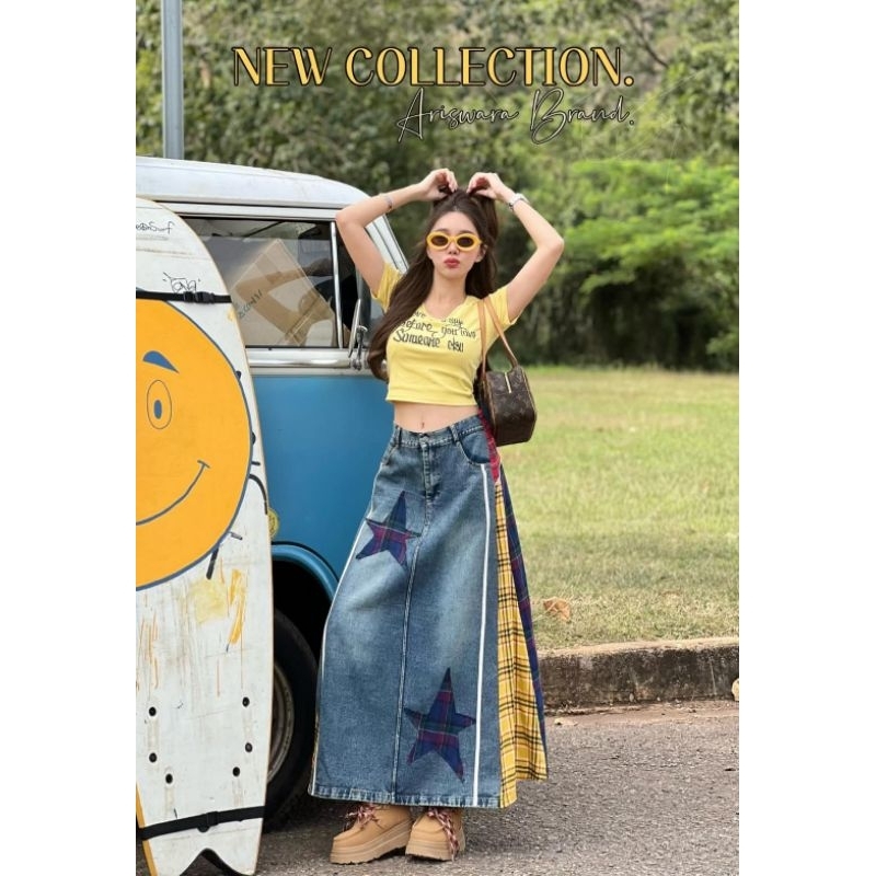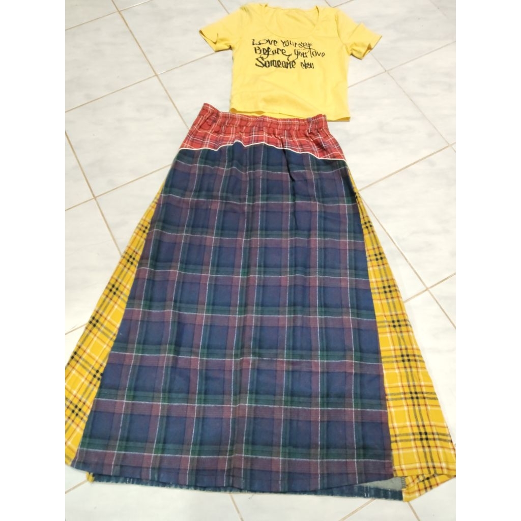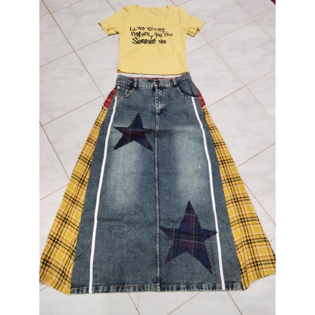 (New) Imported From Ariswara Brand (Fz):: Set Yellow Crop Top + Long Denim Skirt With Navy Plaid Pattern
