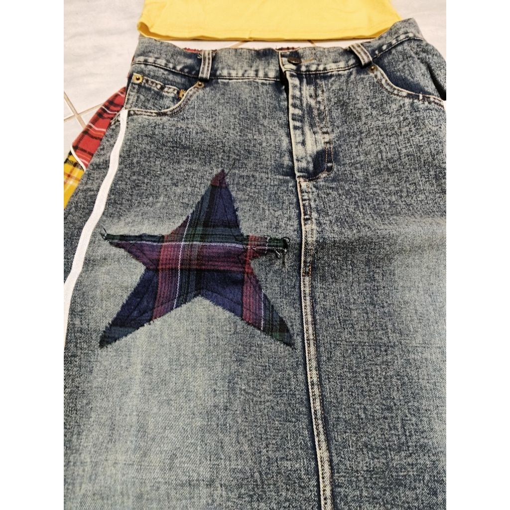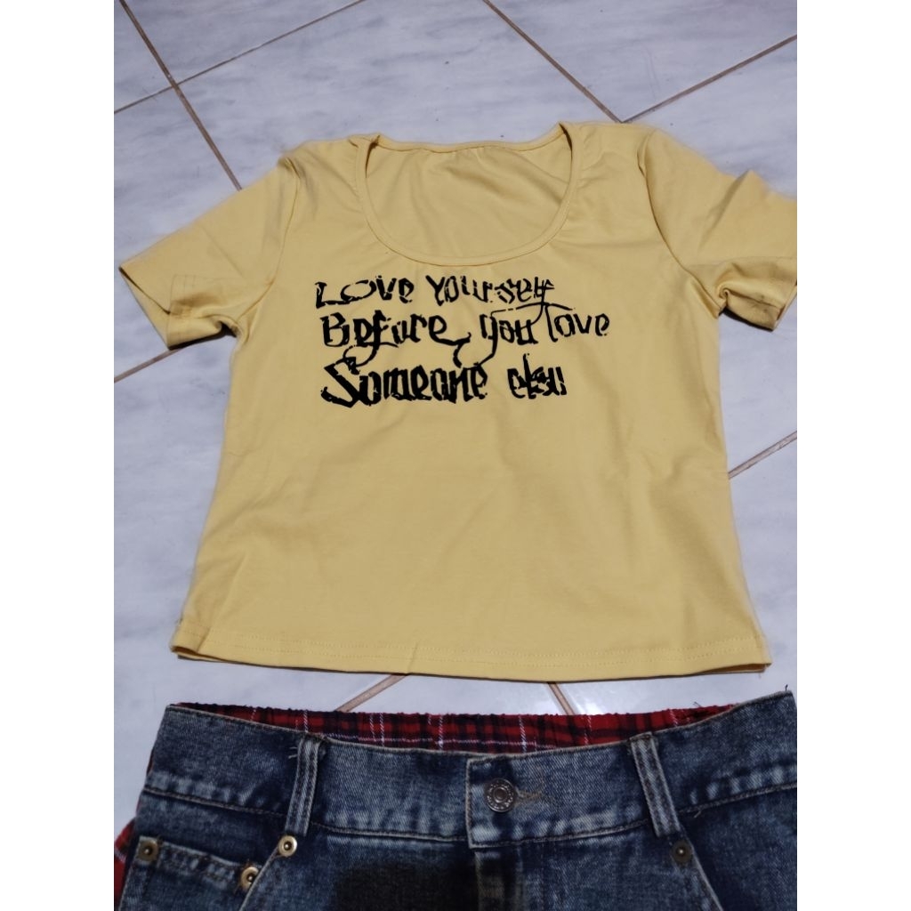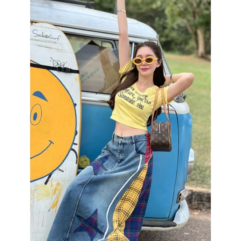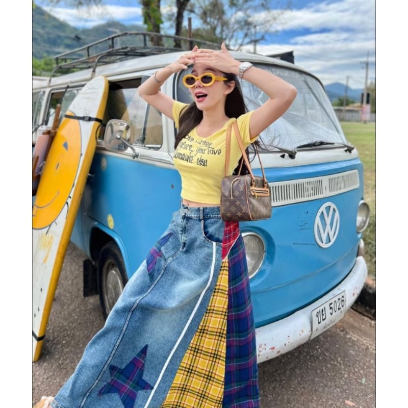 (New) Imported From Ariswara Brand (Fz):: Set Yellow Crop Top + Long Denim Skirt With Navy Plaid Pattern