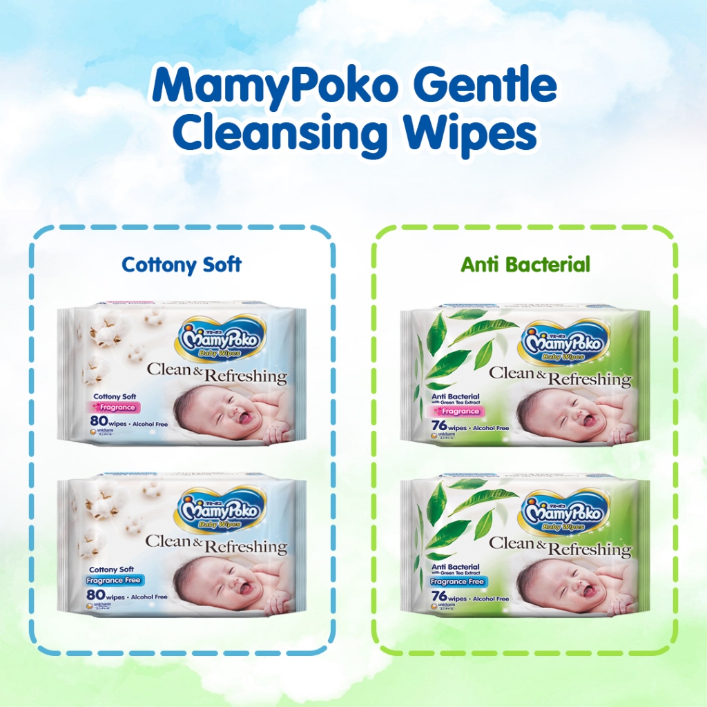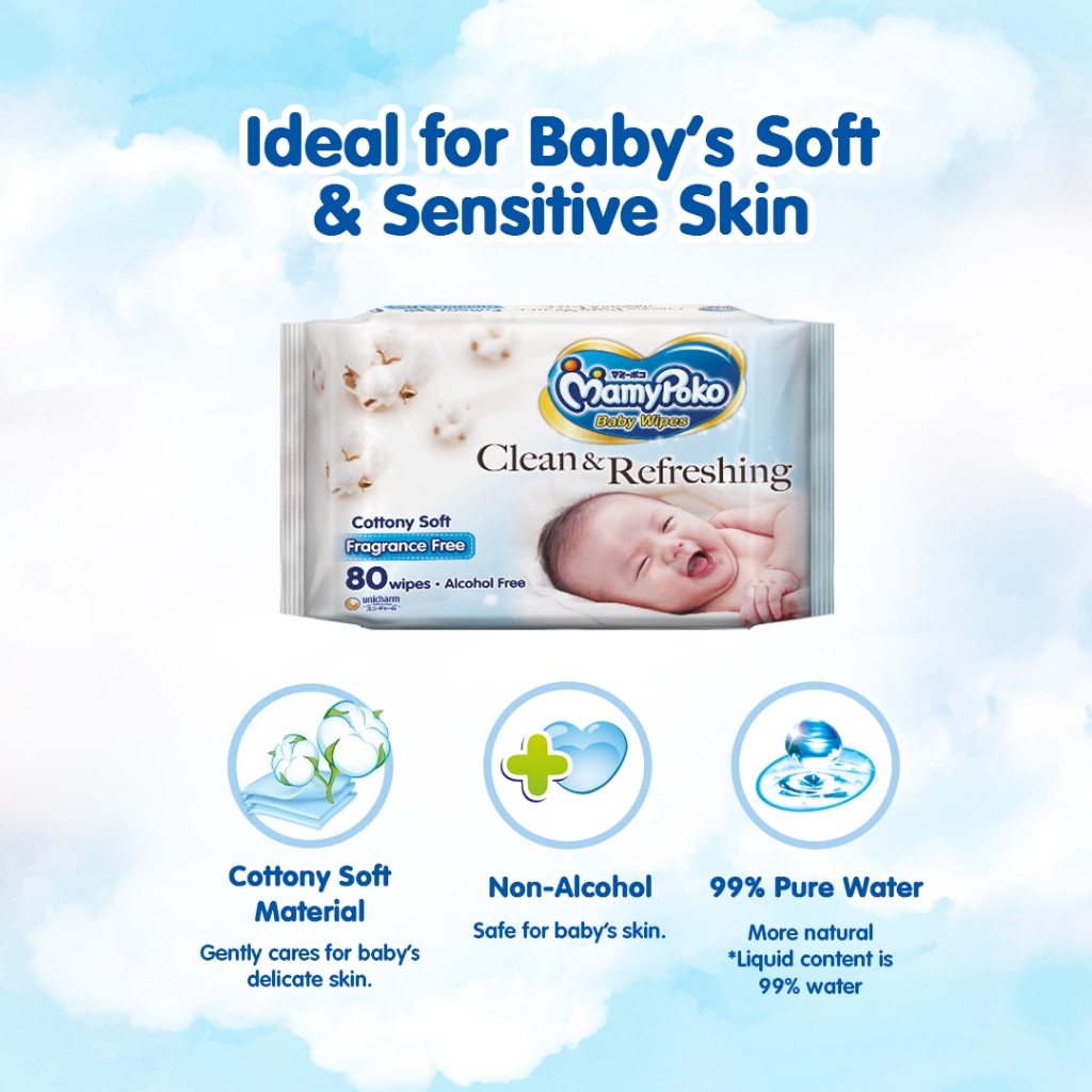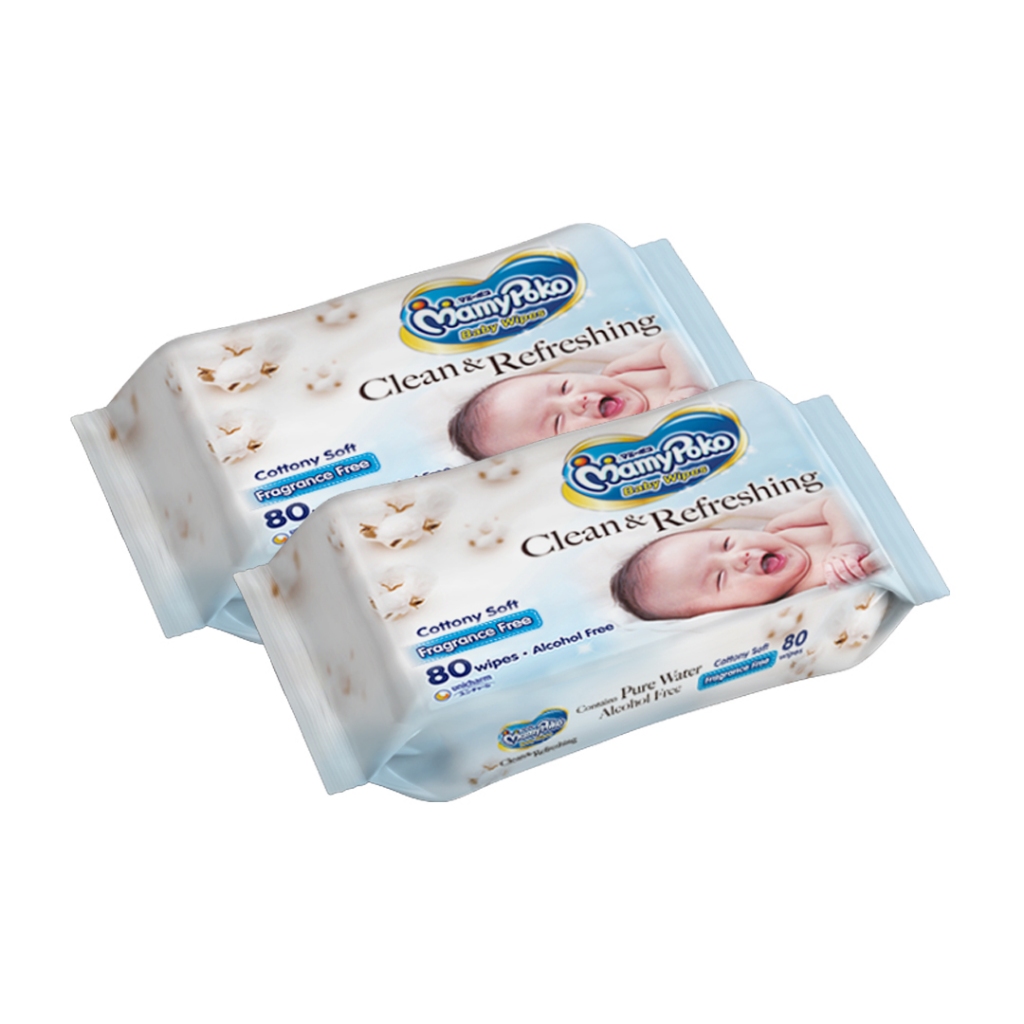 MAMYPOKO Clean & Refreshing Baby Wipes Cottony Soft Fragrance Free 80 pulls x 2 packs (160 pulls)