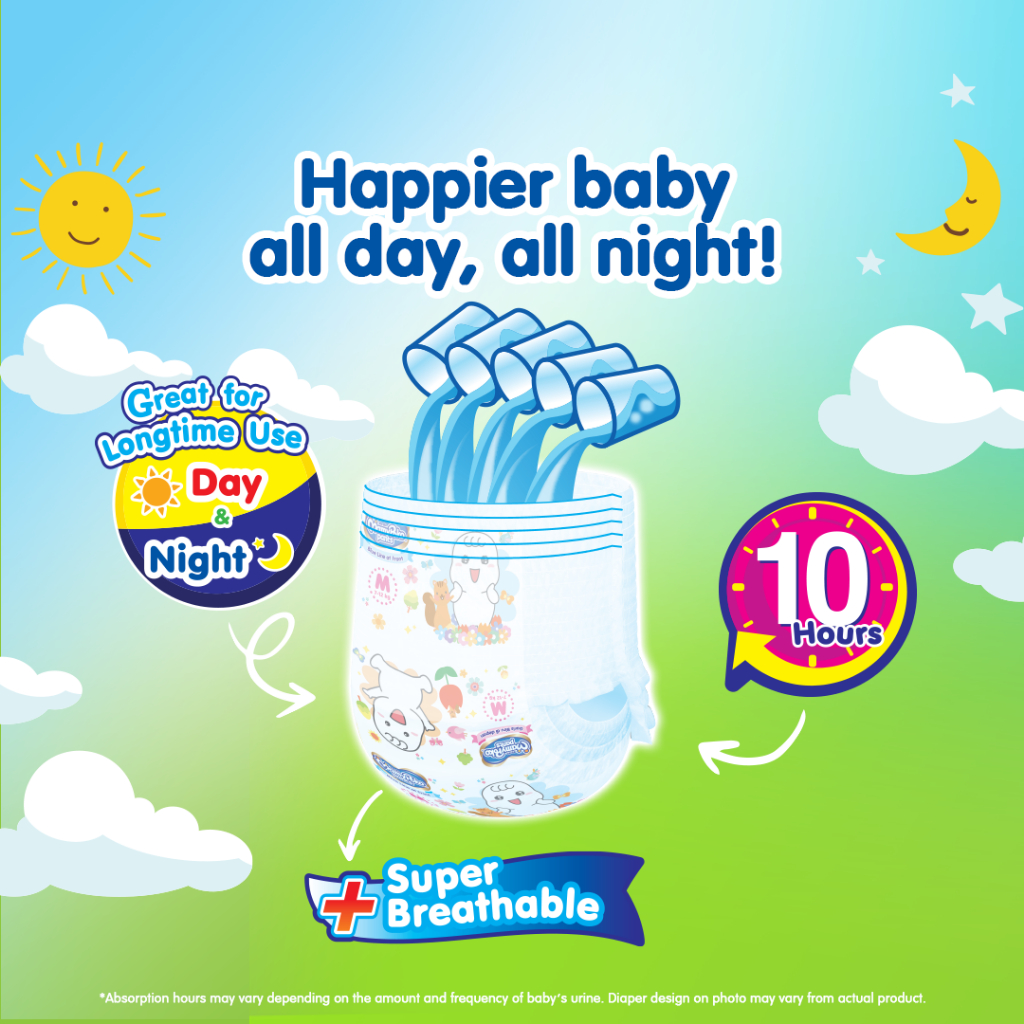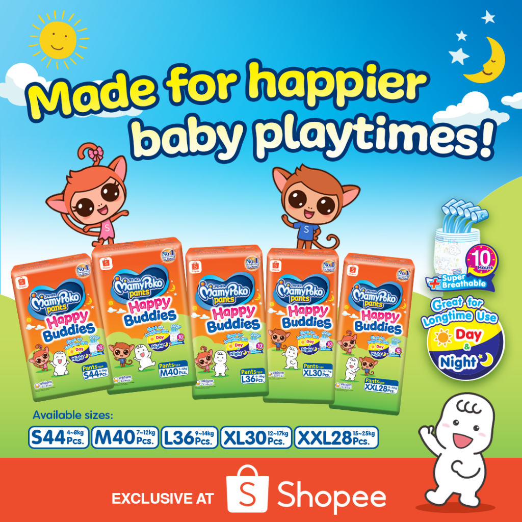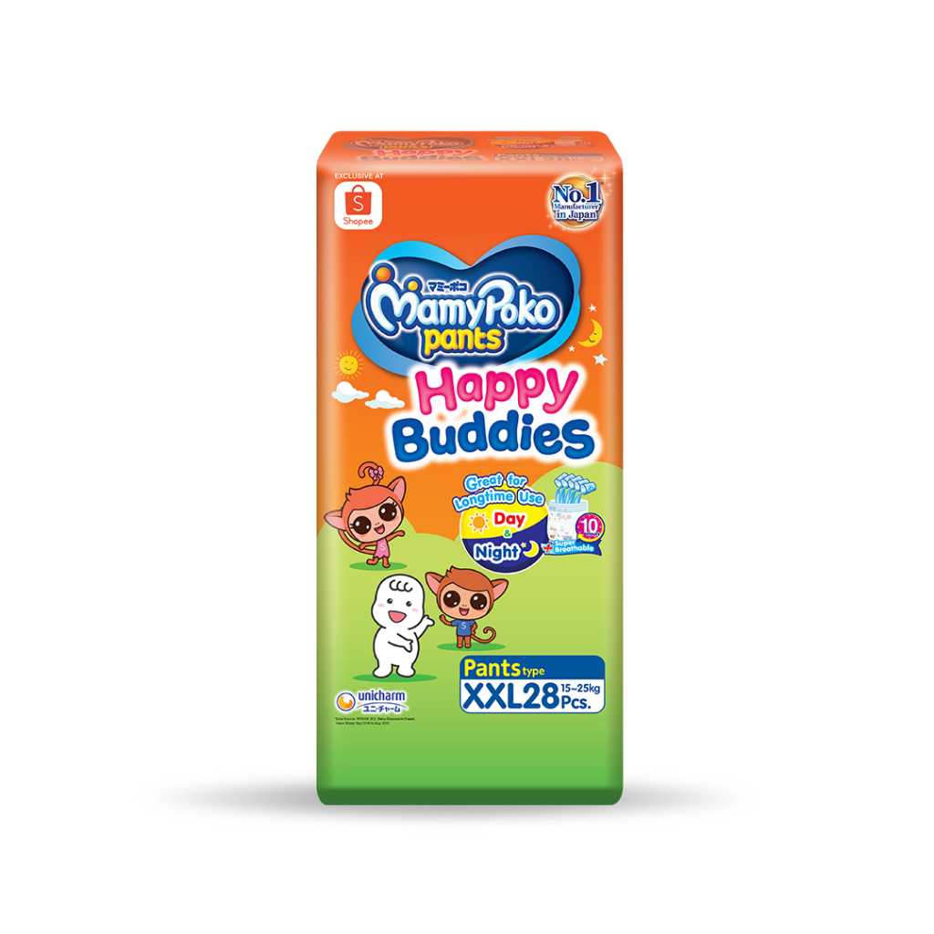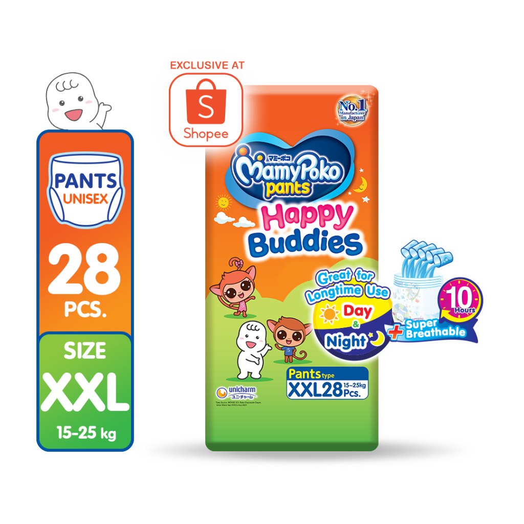 [SHOPEE EXCLUSIVE] MAMYPOKO Happy Buddies Baby Disposable Diaper Pants Unisex XXL 28 pcs