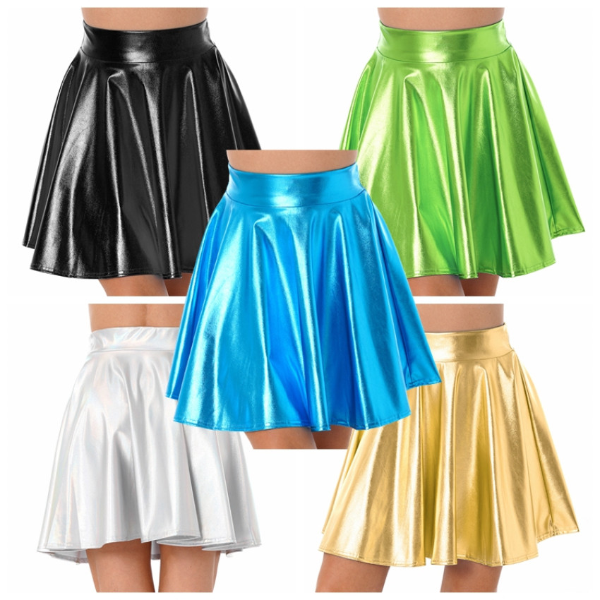 Women Glossy High Waist Flare Skirt Club Stage Costume Party Dancewear Shiny Metallic Ruffle Skirts
