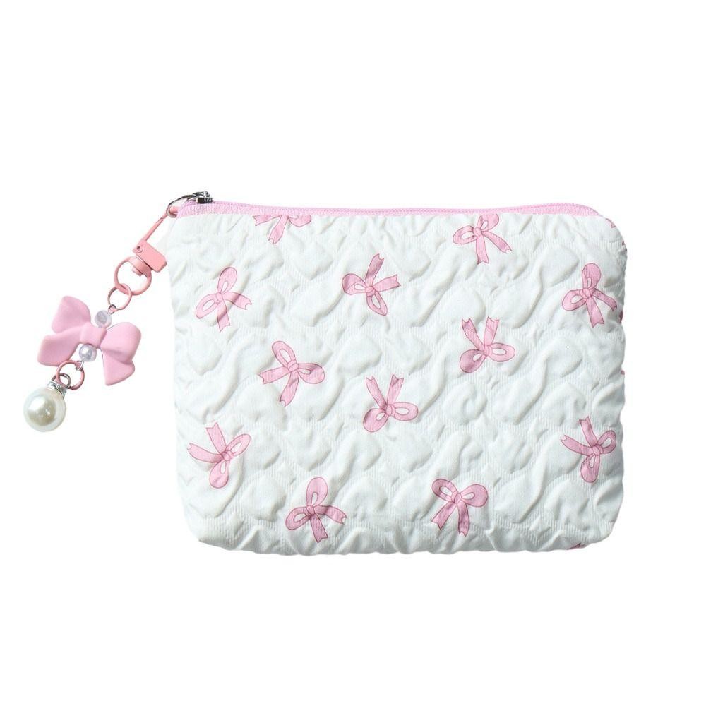 KANGNAI Cotton Makeup Bag, Little Bow Large-Capacity Travel Cosmetic Bag, Portable Quilted Girls' Make Up Organizer for Women