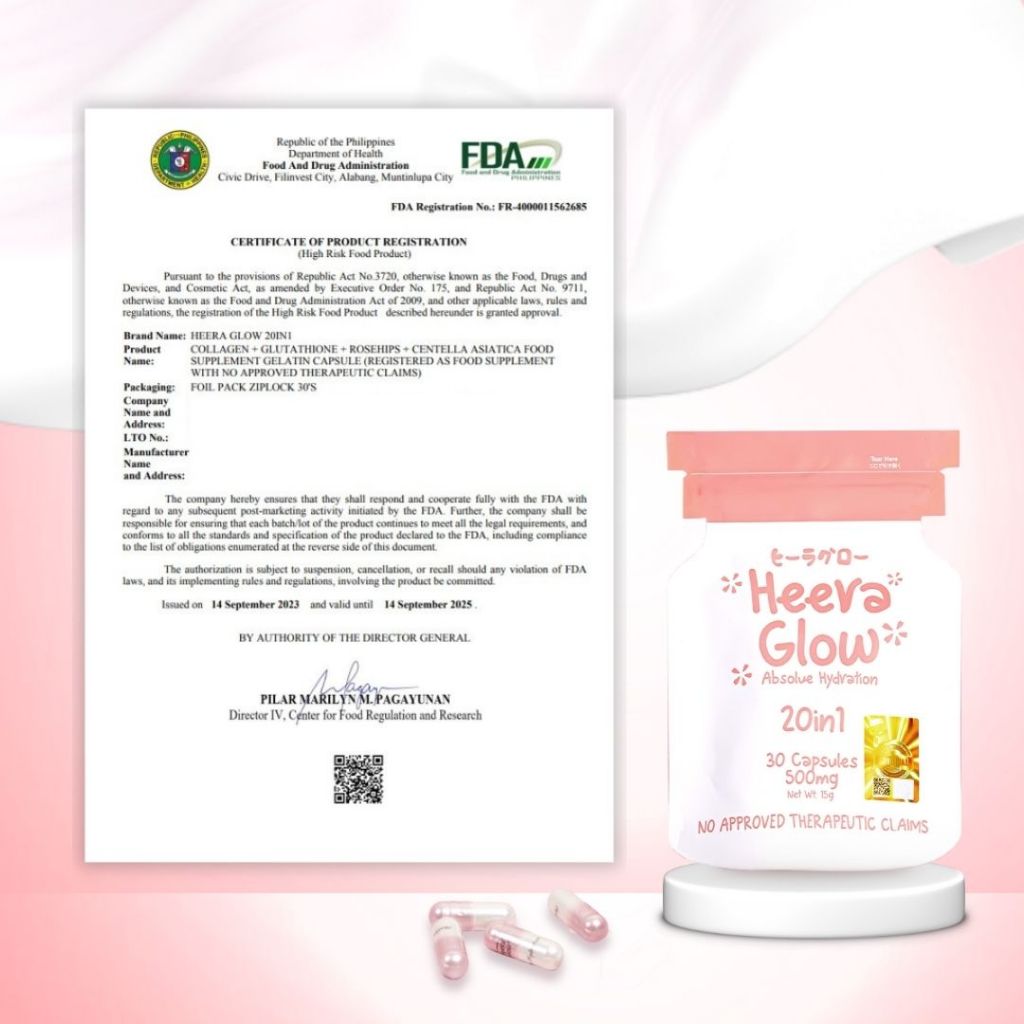 Heera Glow 20in1 Glutathione Absolue Hydration Collagen 30caps Whitening, Anti-aging and Hydrating