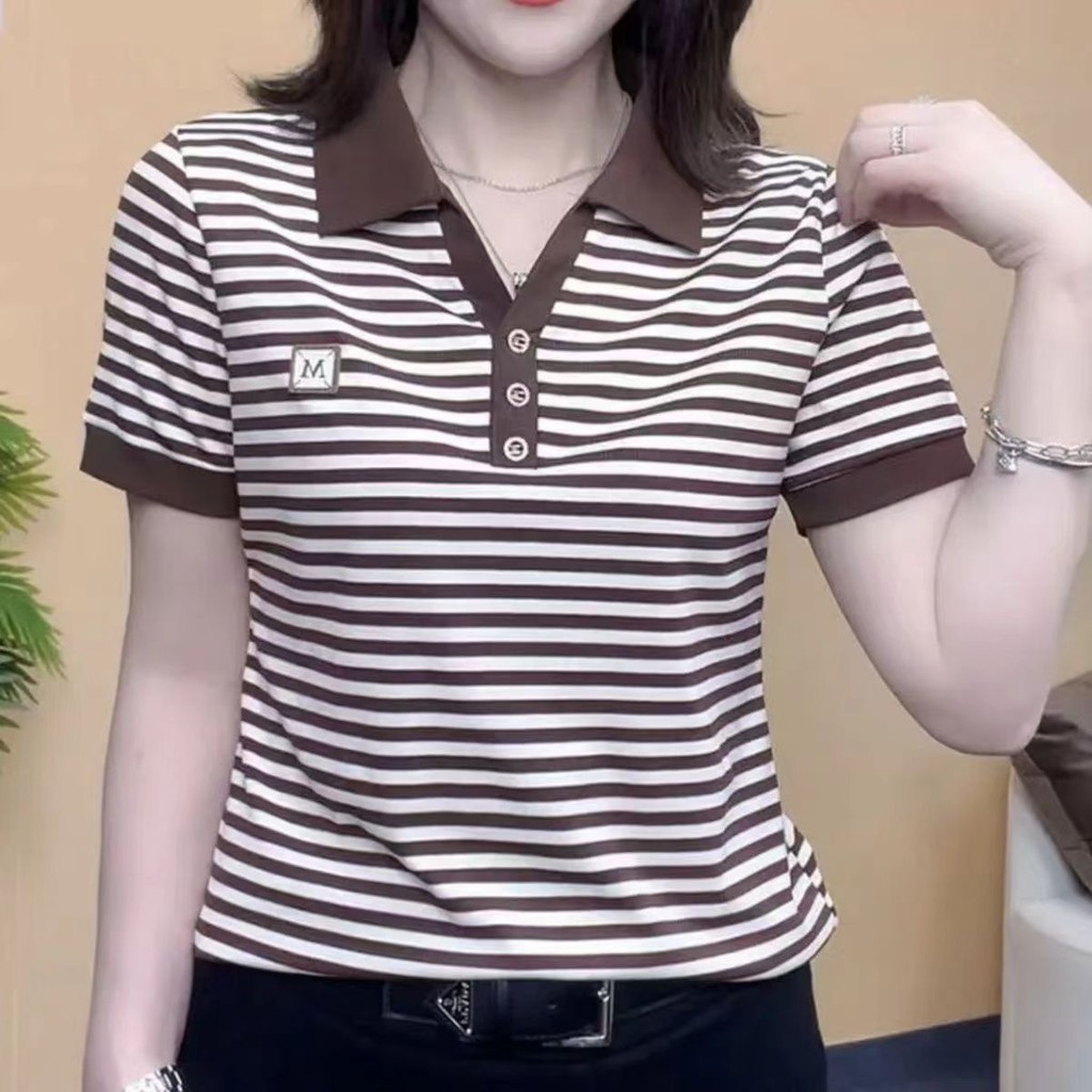 2026 Women's Summer New Loose Versatile Fashion Polo Collar Striped Short sleeved T-shirt Polo