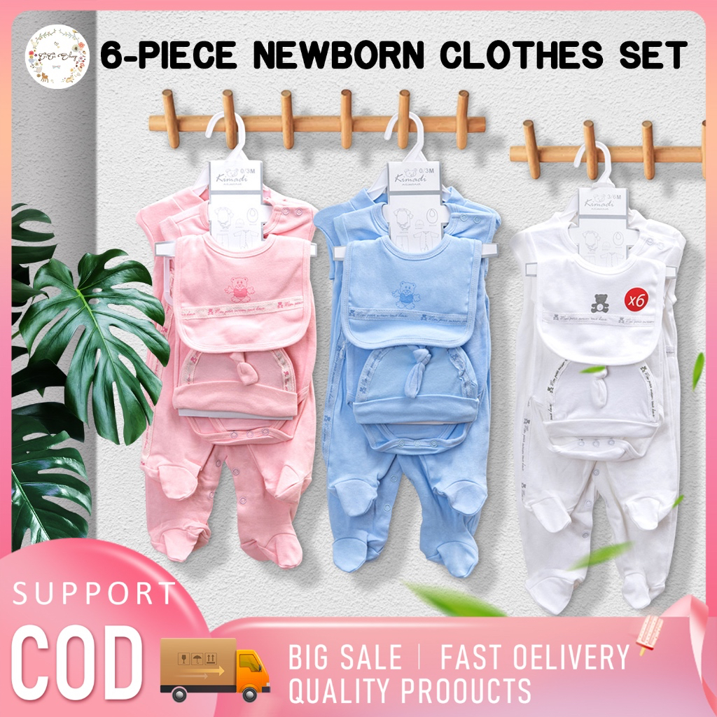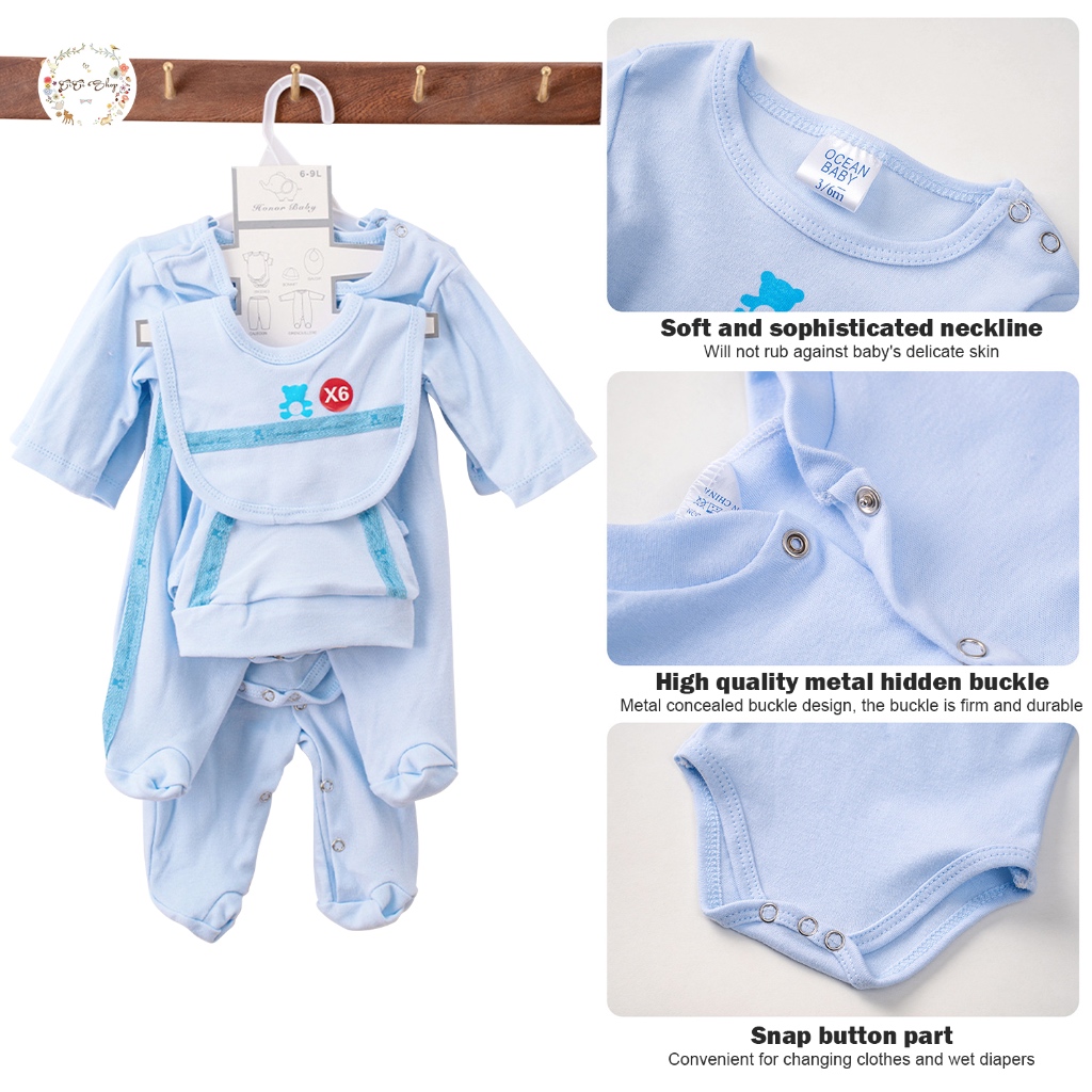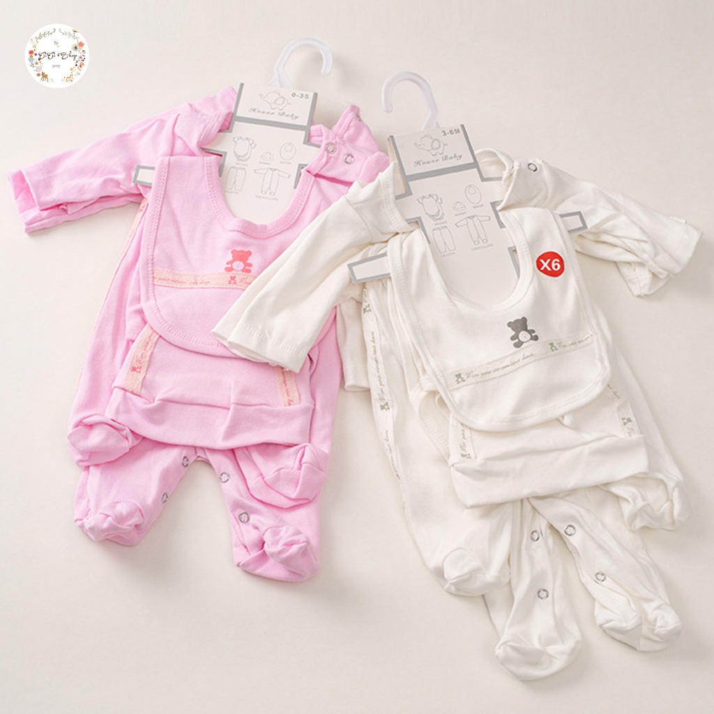 6pcs/Set Baby Cotton Onesie Pants Bibs Hats Bodysuits Frogsuit Newborn Clothes Gift Set 0-9M
