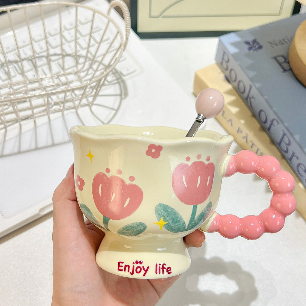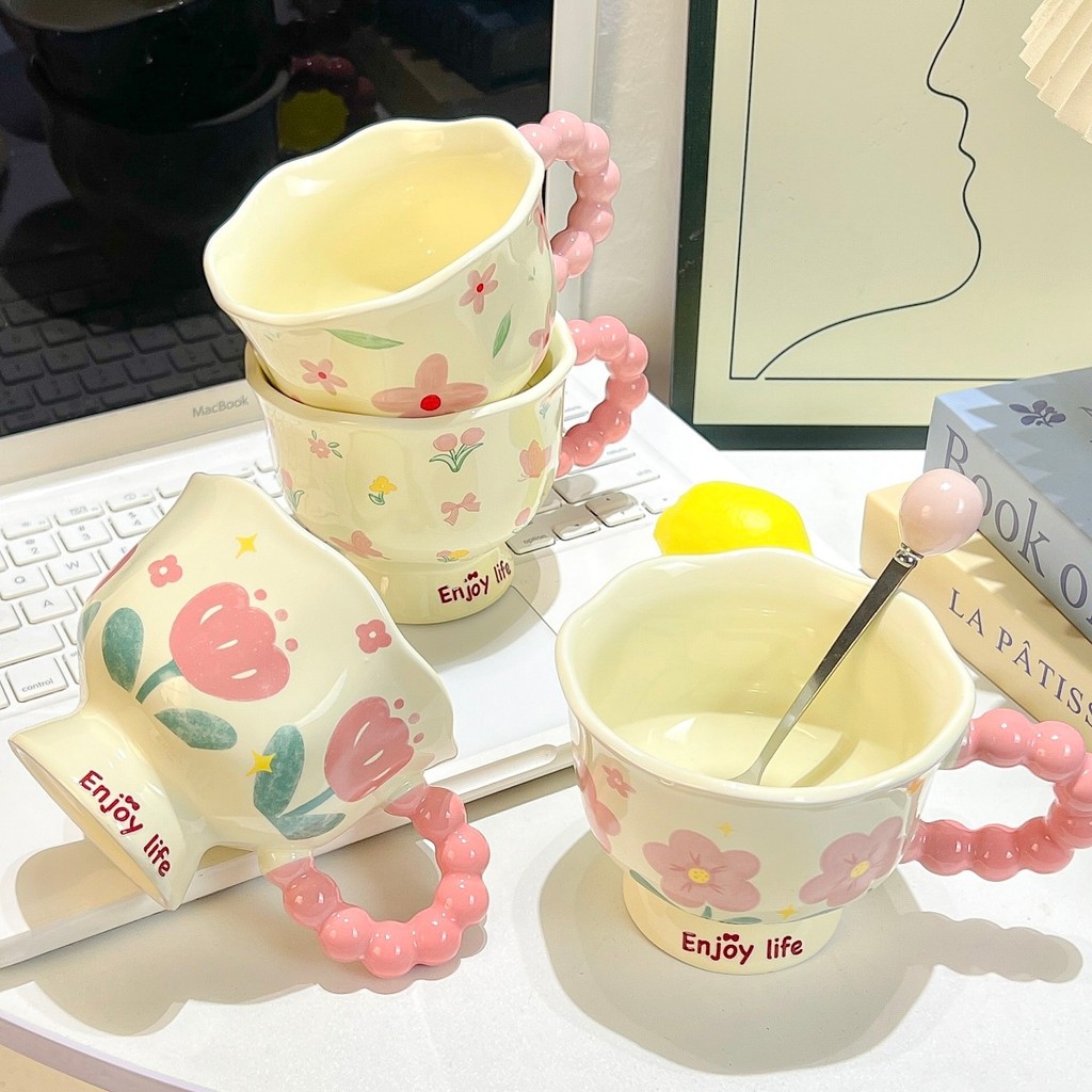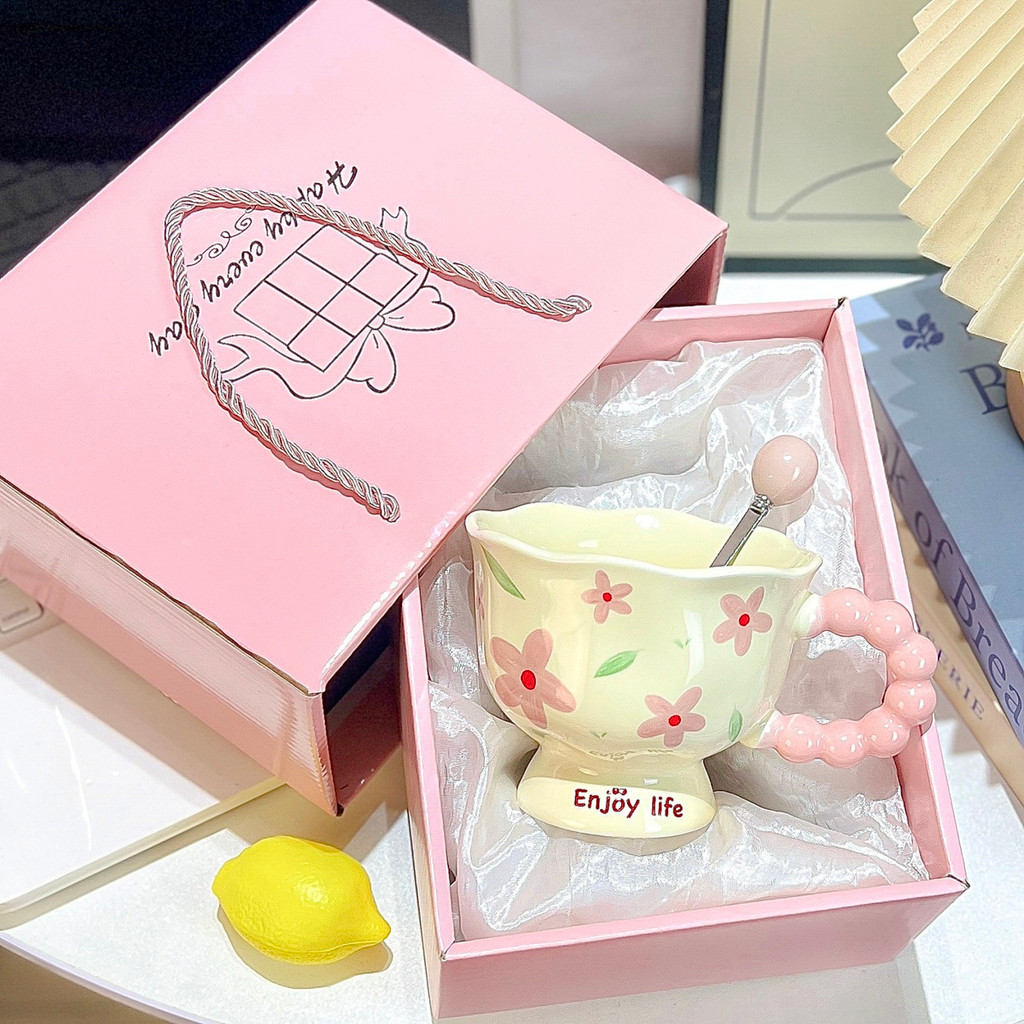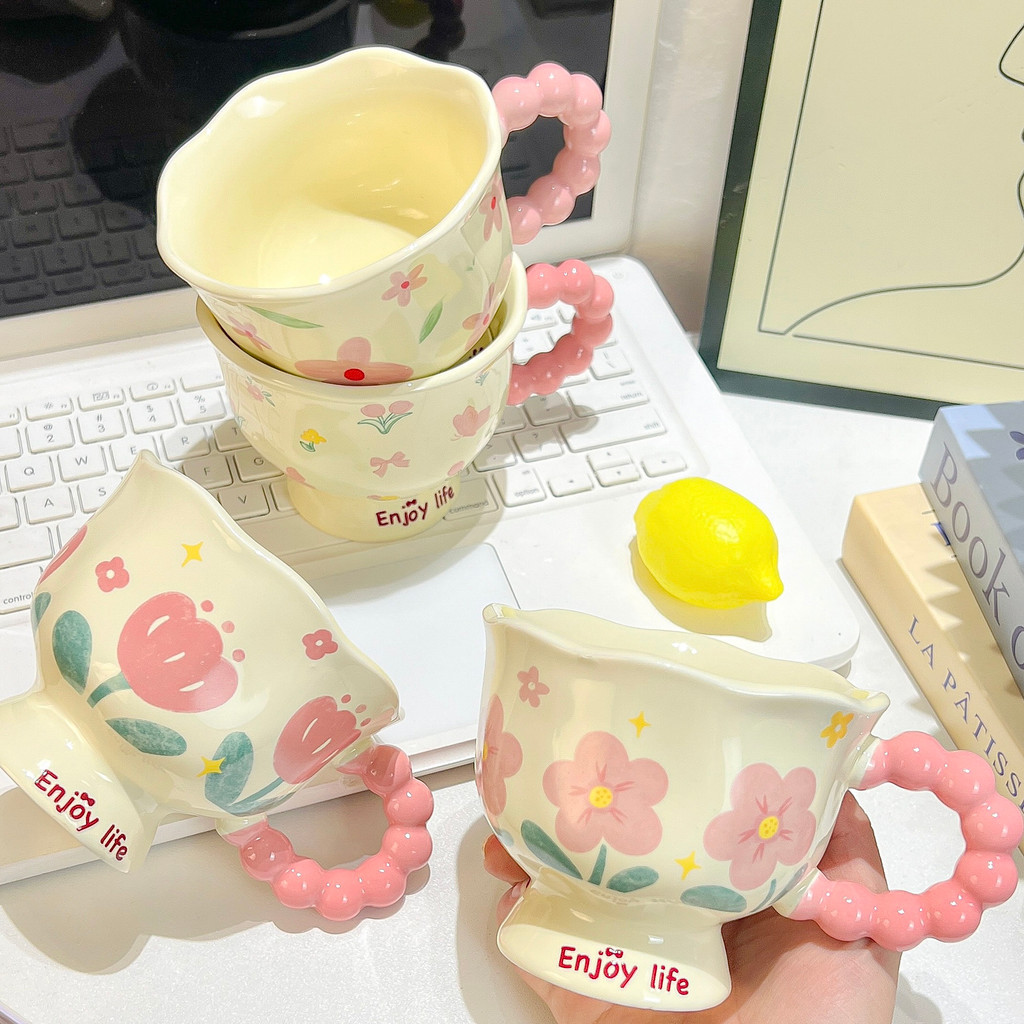Mug Water Cup Coffee Cup Milk Cup Cute ins Flower Mug High-value Ceramic Cup Couple Water Cup Girl Birthday Gift Souvenir