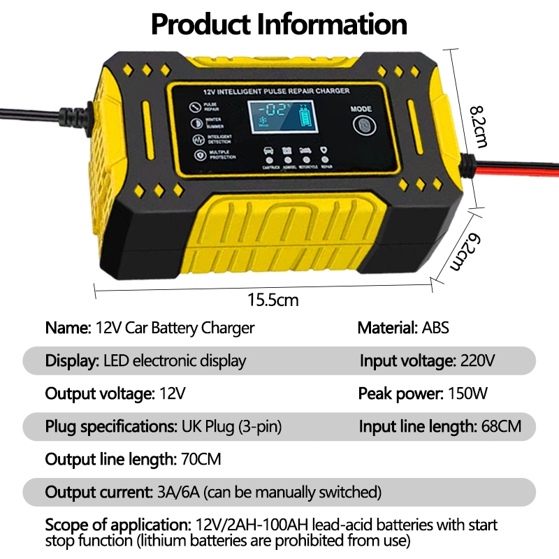 Full Automatic Car Battery Charger 12V 3A /6A Intelligent Repair Fast Power Charging LCD Display