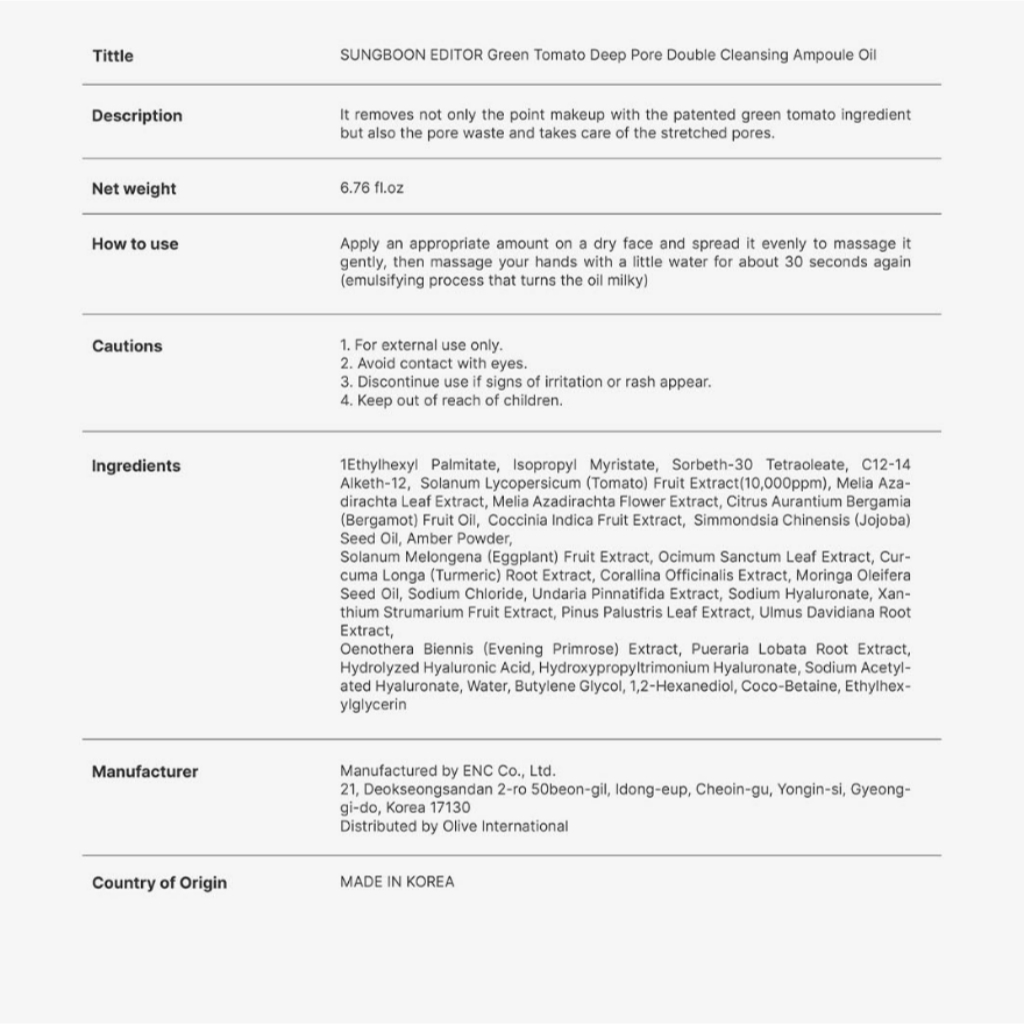 [SUNGBOON EDITOR] Green Tomato Deep Pore Double Cleansing Ampoule Oil 200ml
