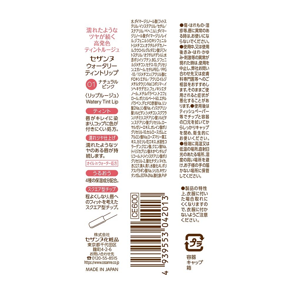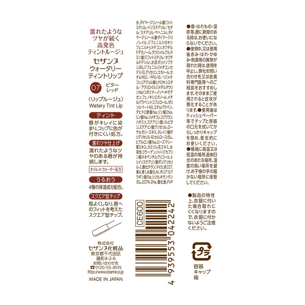 Cezanne Watery Tint Lip 4.0g Tint formula glossy long-lasting lipstick (12 different color)