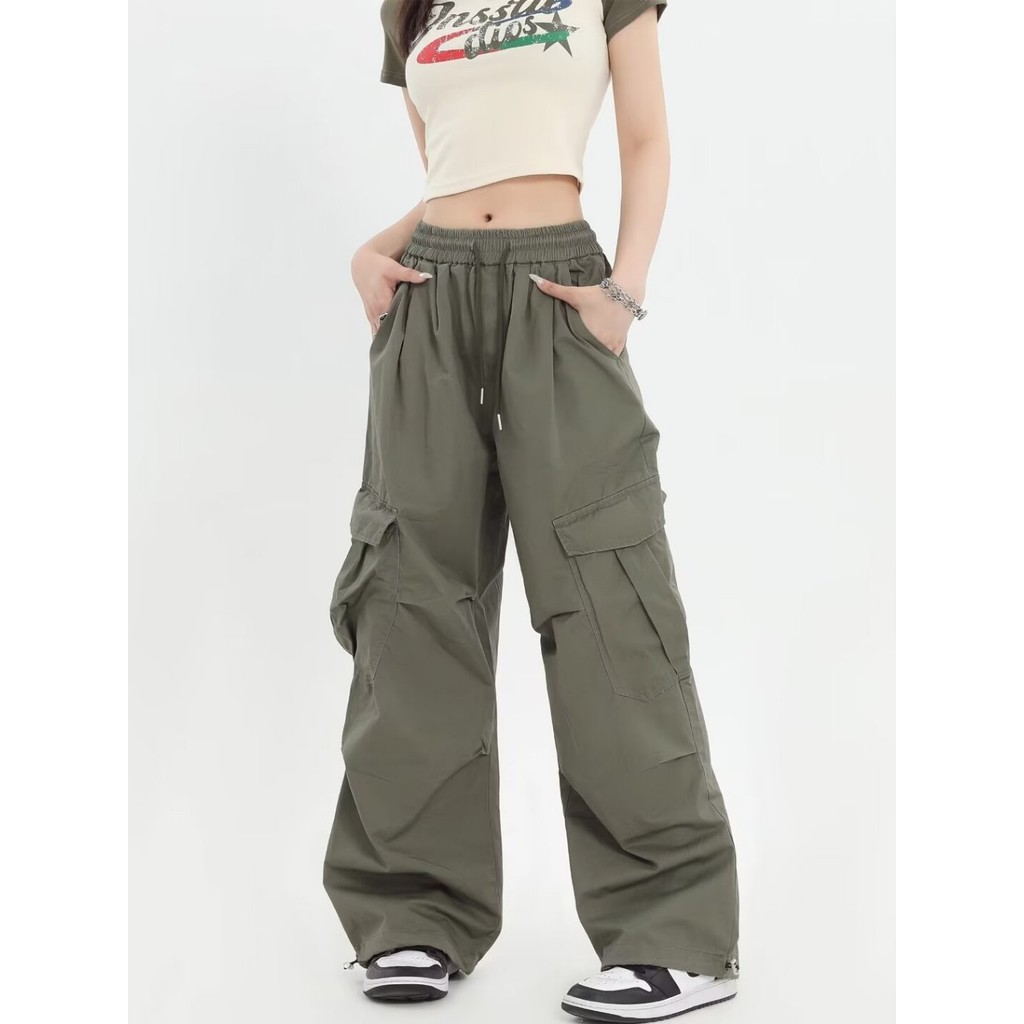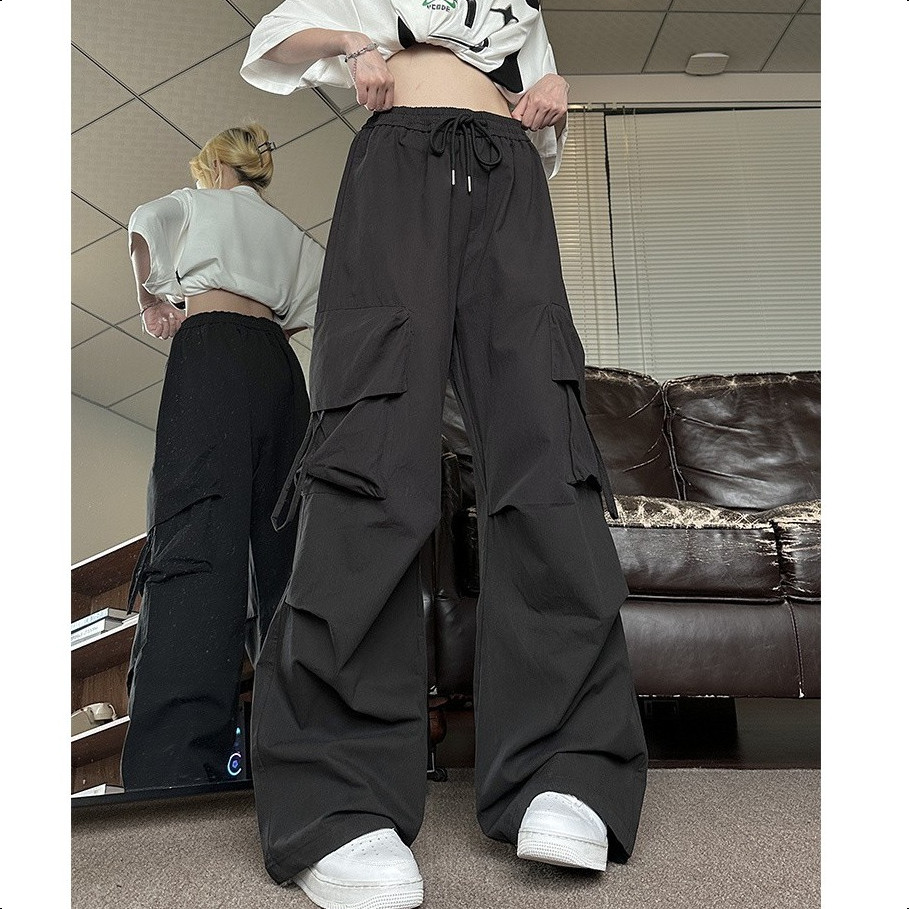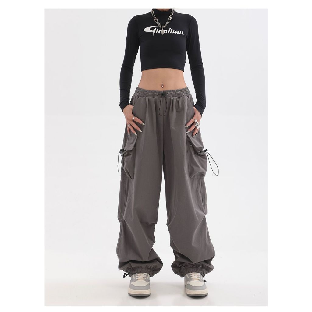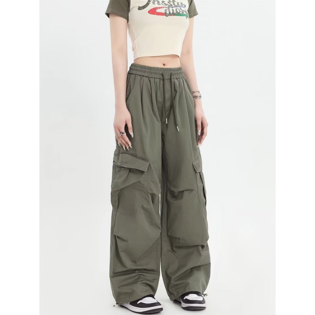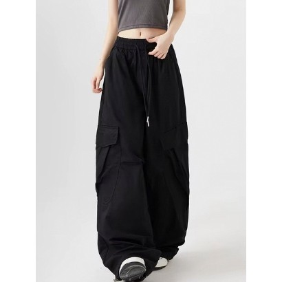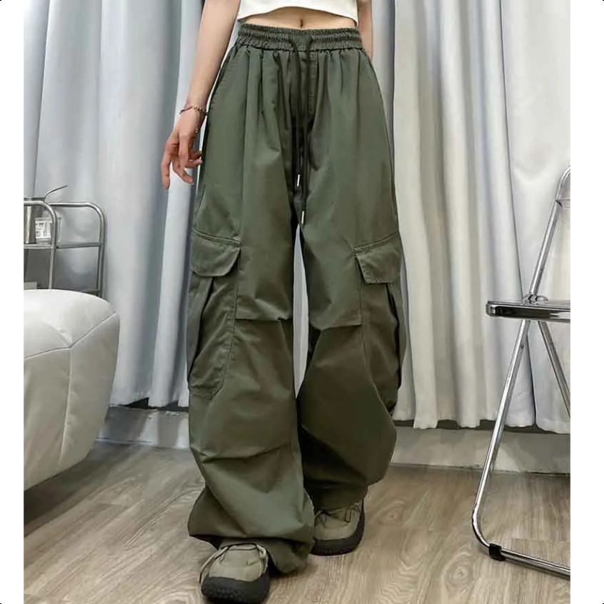 GDTIMA Retro Cargo Pants Women Loose Pockets Wide Leg Drawstring Casual Trousers