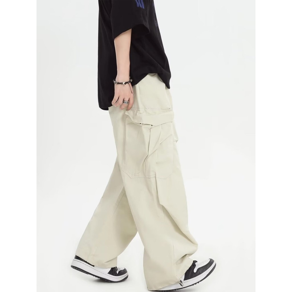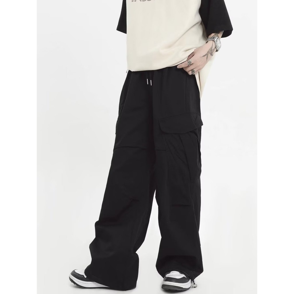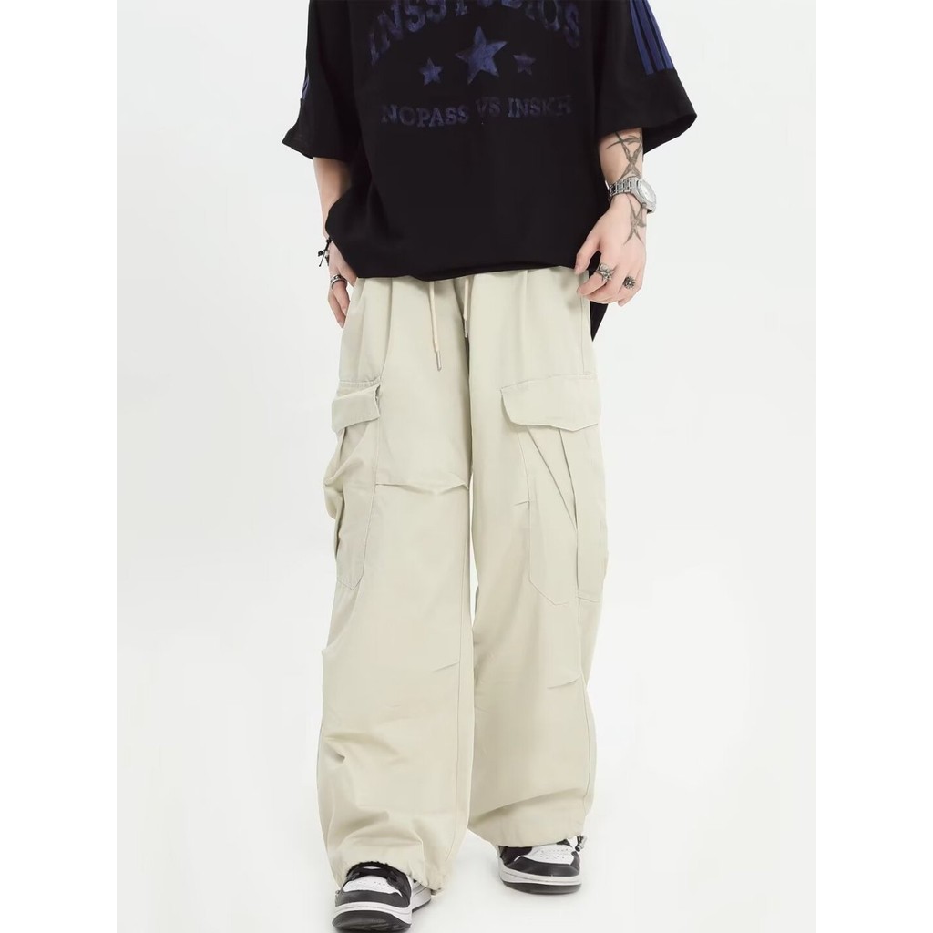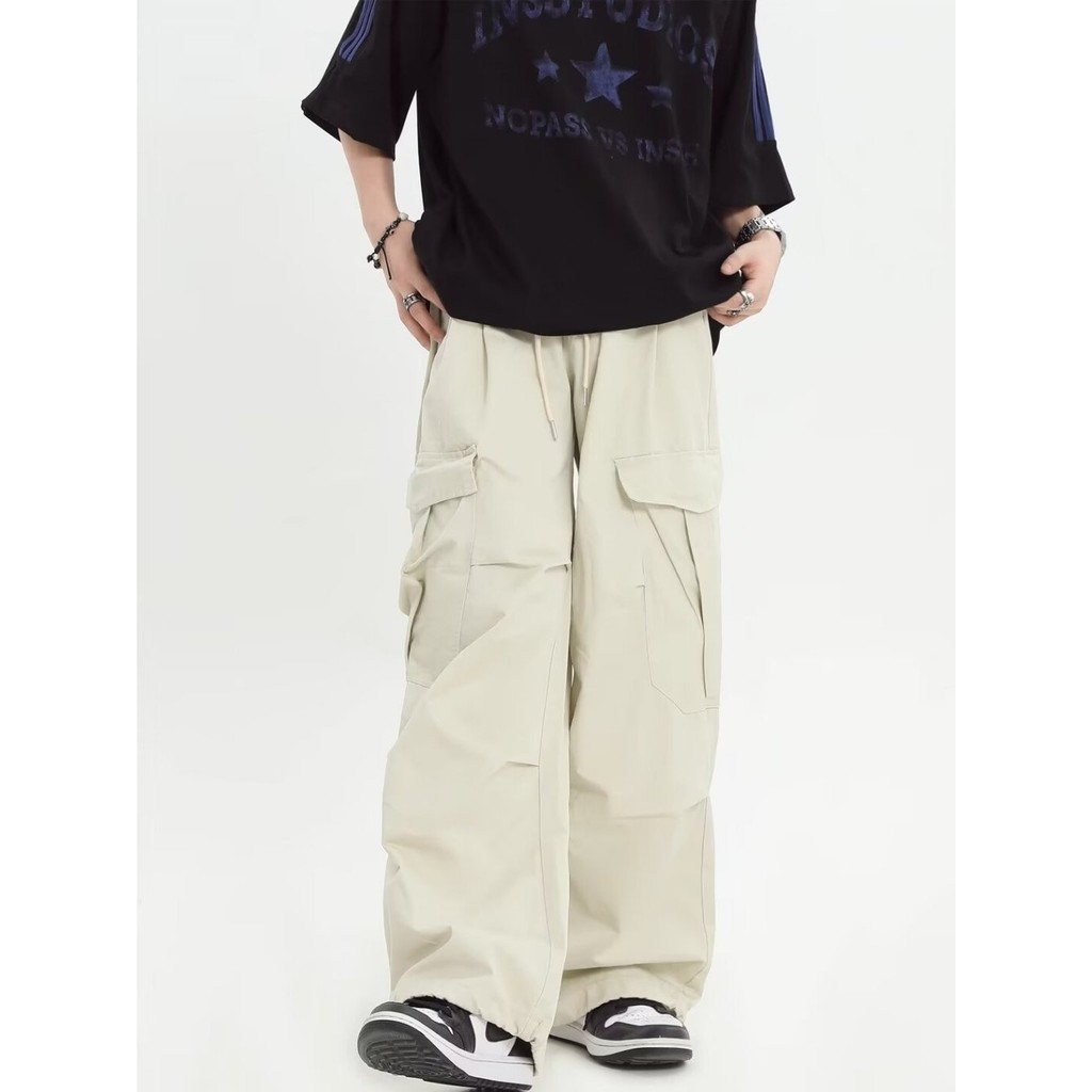 GDTIMA Retro Cargo Pants Women Loose Pockets Wide Leg Drawstring Casual Trousers