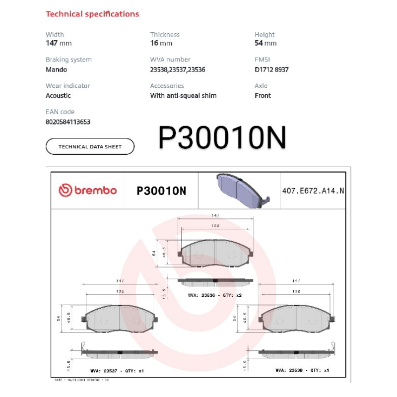 Brembo Brake Pad P30010N Front Hyundai H100 2007-2021