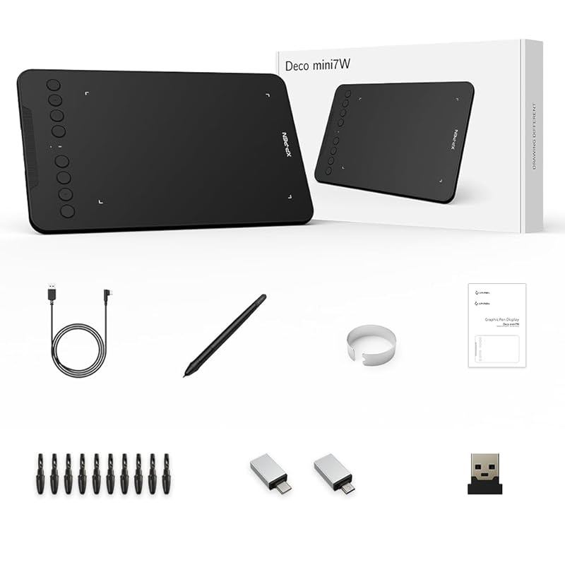 XPPen Deco mini7W pen tablet wireless connection compatible with Bluetooth & 2.4GHz, lightweight design, suitable for illustration, design, and compatible with Android/Windows/macOS/ChromeOS.