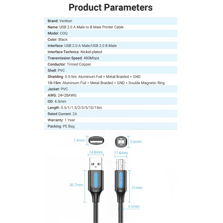 Vention COQ USB Printer Cable USB Type A Male to B Male for Hp Canon Epson, 480Mbps