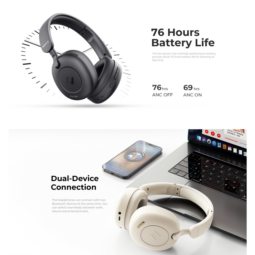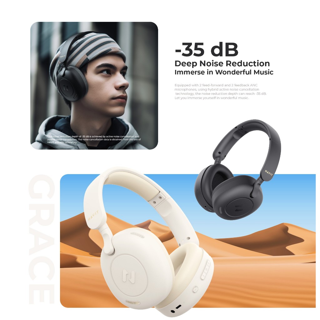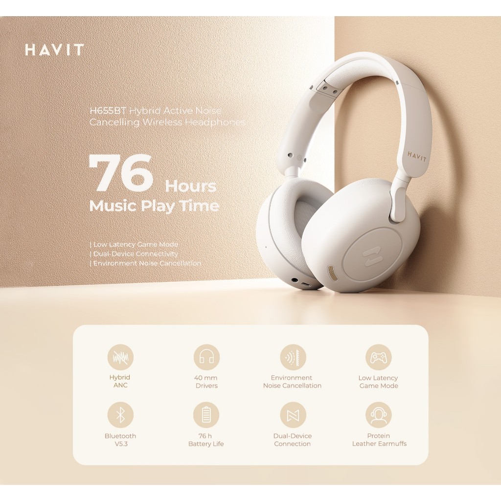Havit Helios H655BT || Hybrid Active Noise Cancelling Wireless Headphones || Black and Beige