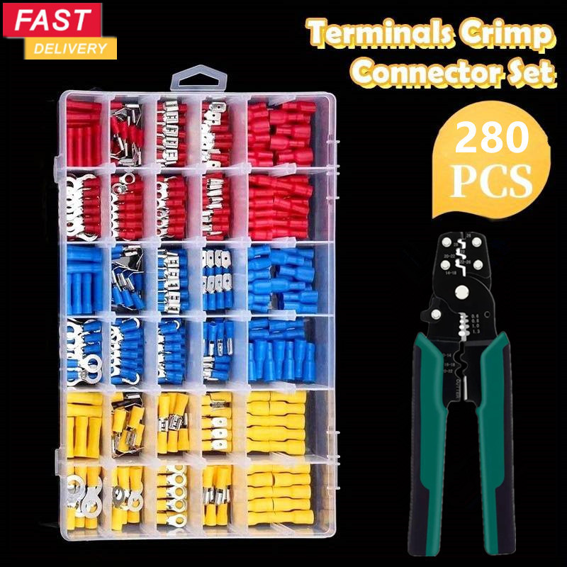 [PH Stock] 280pcs Insulated Spade Crimp Wire Terminal Connectors + Wire Stripper & Crimper Pliers (0.6 ~ 2.6mm Cable) Waterproof Electrical Cable Connector Kit with Assorted Sizes