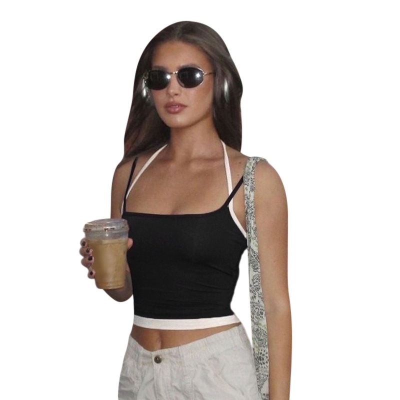 Women Contrast Color Camisoles Spaghetti Strap Sleeveless Tank Tops Summer Fake Two-Pieces Slim Fit