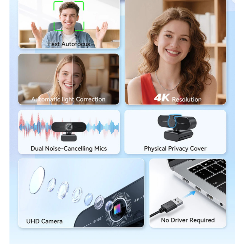 4K Webcam 1440P 2K Web Camera 1080P EMEET C60E Autofocus USB Computer Camera for Living/ Video Call/ Conference