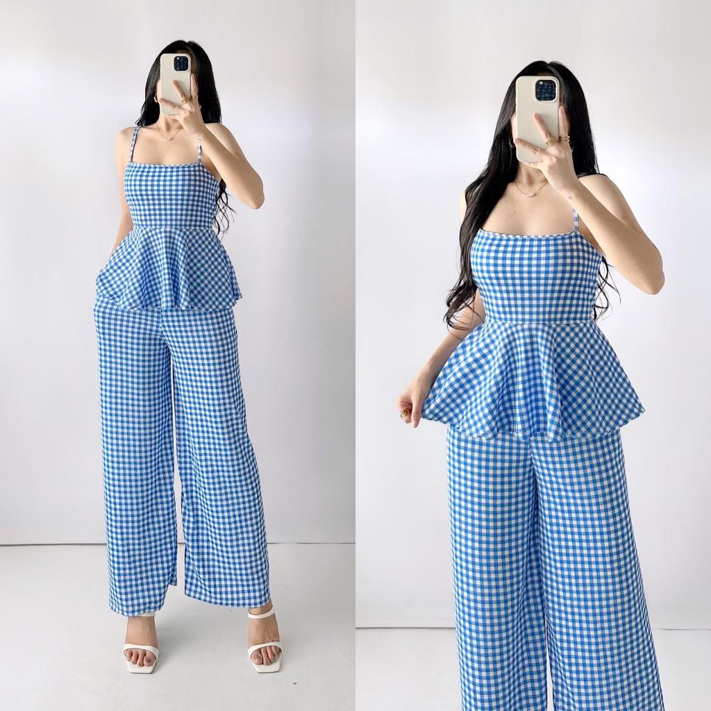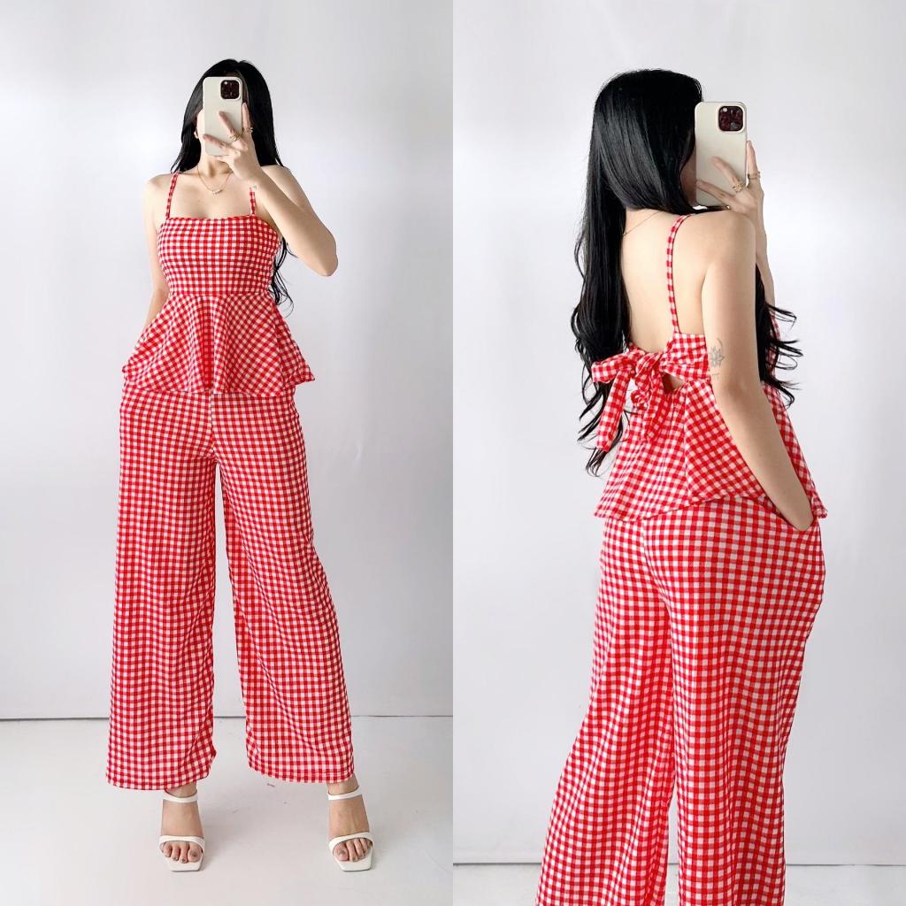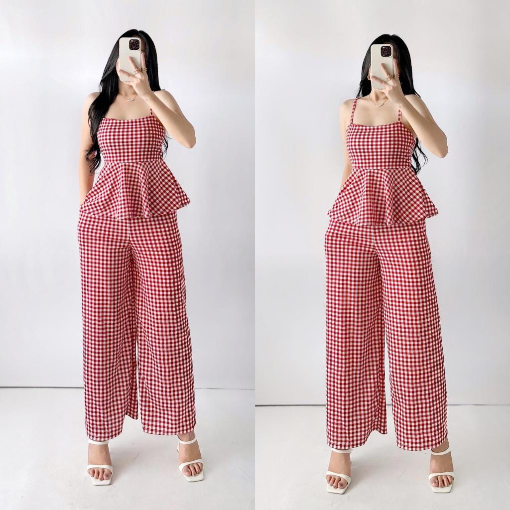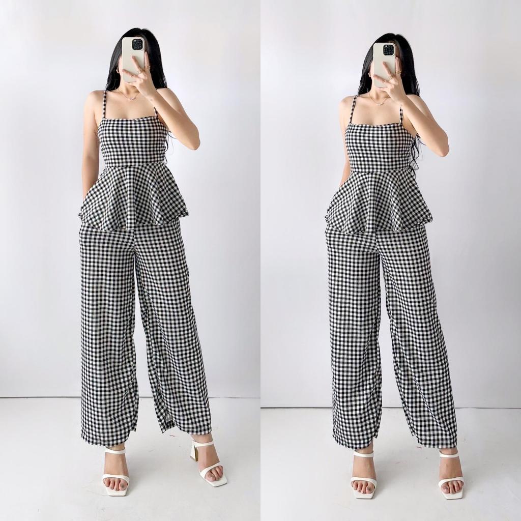 Quennie Checkered Print Casual Crepe Terno with Peplum Top and Wide Leg Pants for Women