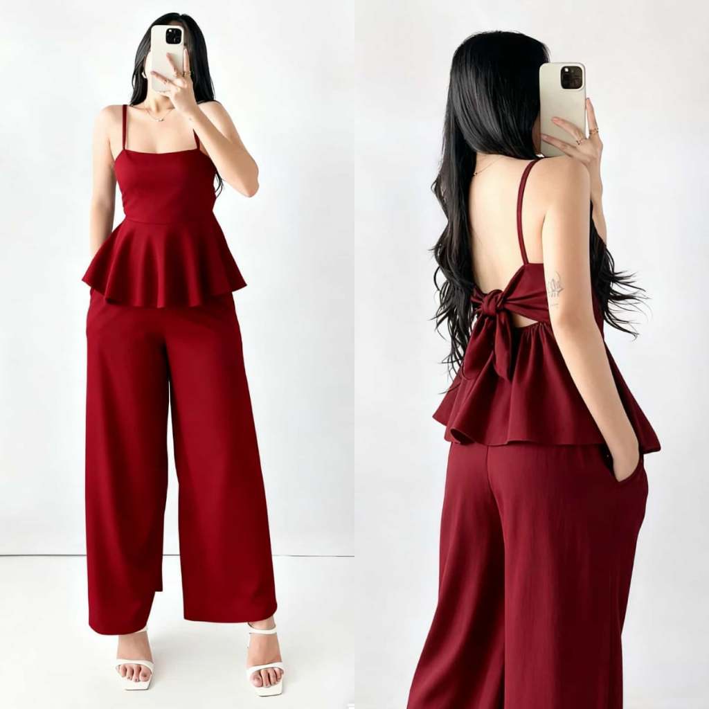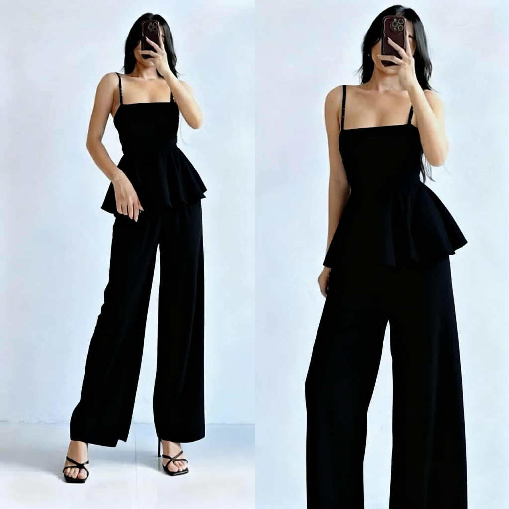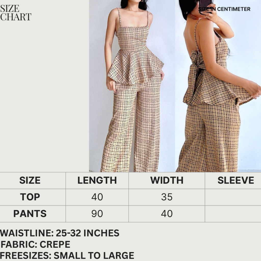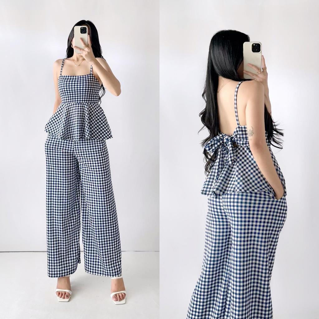Quennie Checkered Print Casual Crepe Terno with Peplum Top and Wide Leg Pants for Women