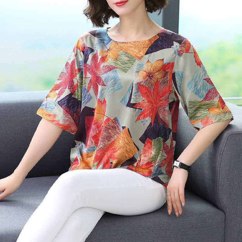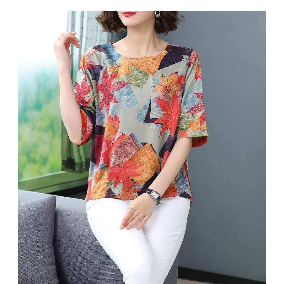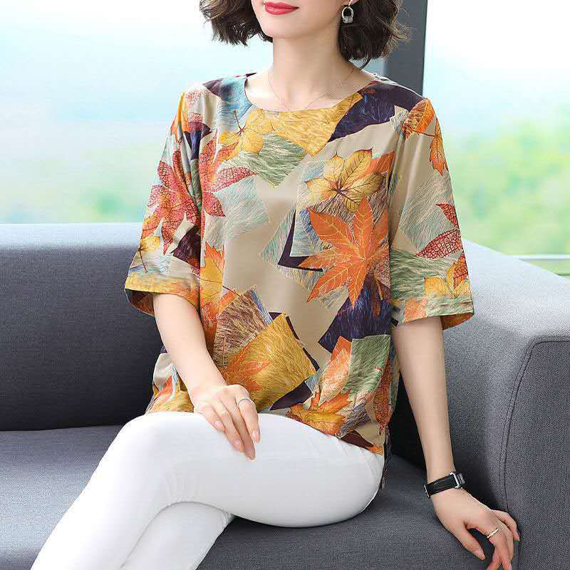 [Floral Middle-Sleeved] T-Shirt Women Spring Summer Loose Slimmer Look Large Size Middle-Aged Mother Wear Printed Bottoming Shirt