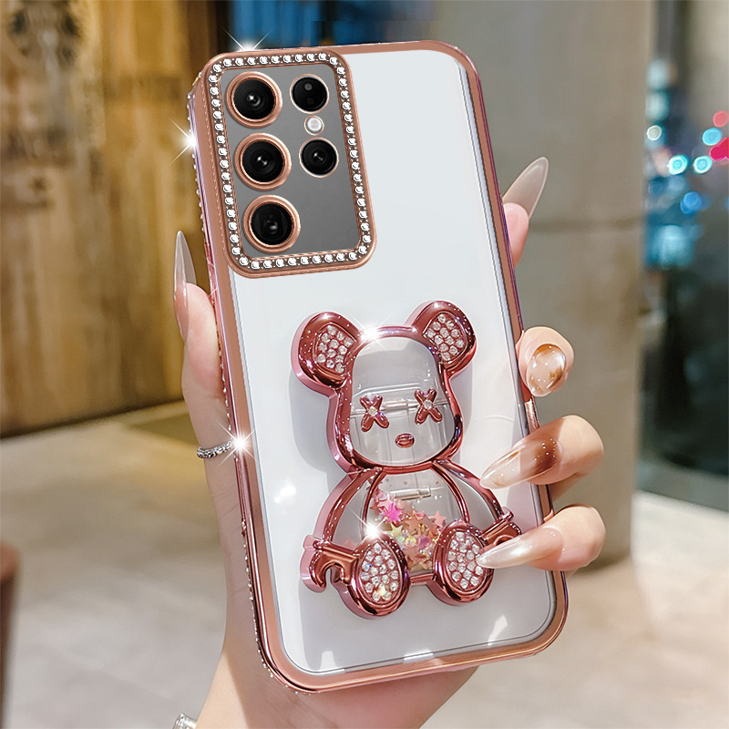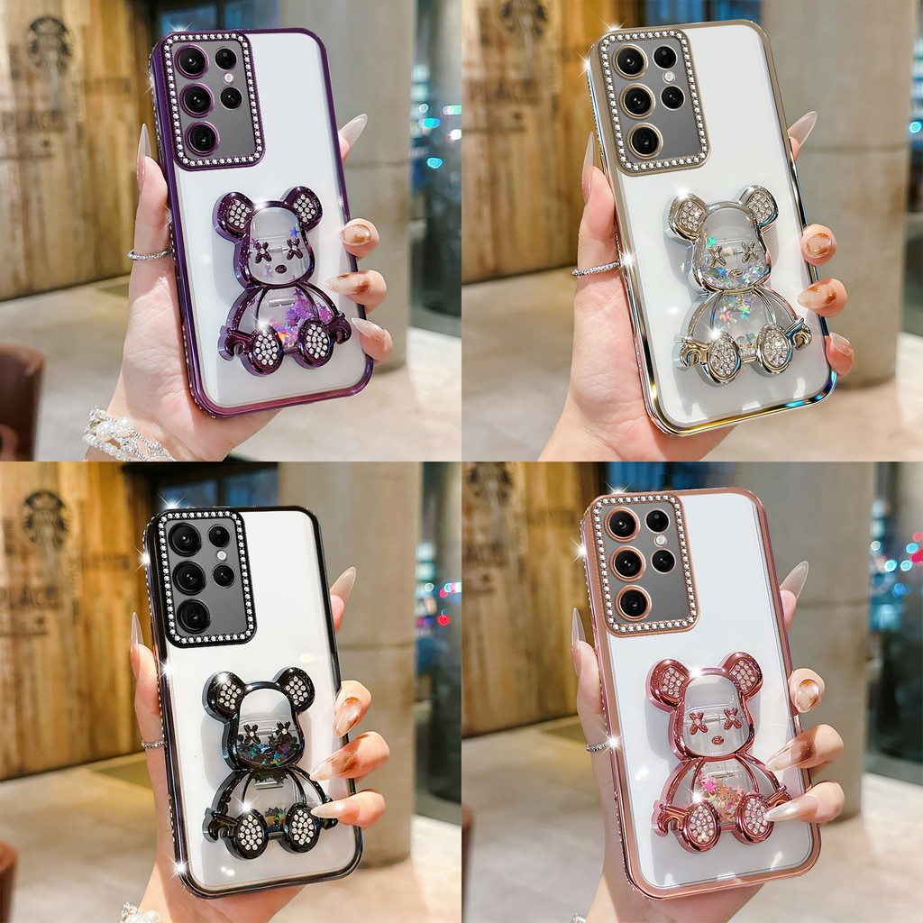 Casing For Samsung Galaxy S22 Ultra S21 Plus S20 FE A50 A50S A30S Luxury Quicksand Bear Stand Bracket Glitter Diamond Clear Phone Cases
