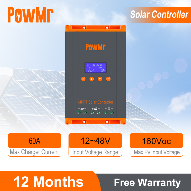 PowMr 60A Mppt Solar Charging Controller Support 12V-48V Battery Automatic 160VDC LCD Fan Parallel Support Up to 12 Units Support Lead Acid Lithium Battery Temperature Compensation