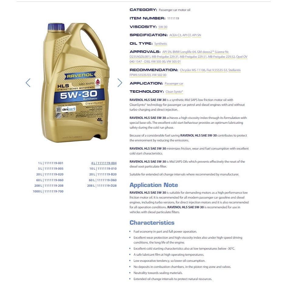 RAVENOL HLS 5W30 DEXOS 2 FULLY SYNTHETIC GASOLINE AND DIESEL ENGINE OIL 1 LITER and 4 LITERS