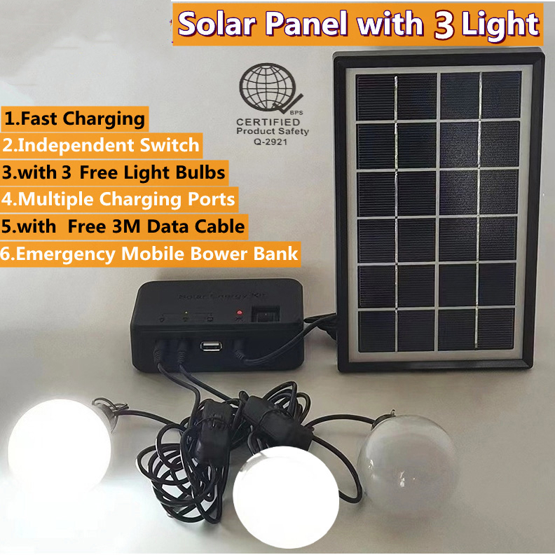Solar Light Panel with 3 Bulbs Camping Light 6W 5V Emergency Fast charging Power Bank Portable Emergency Lamp