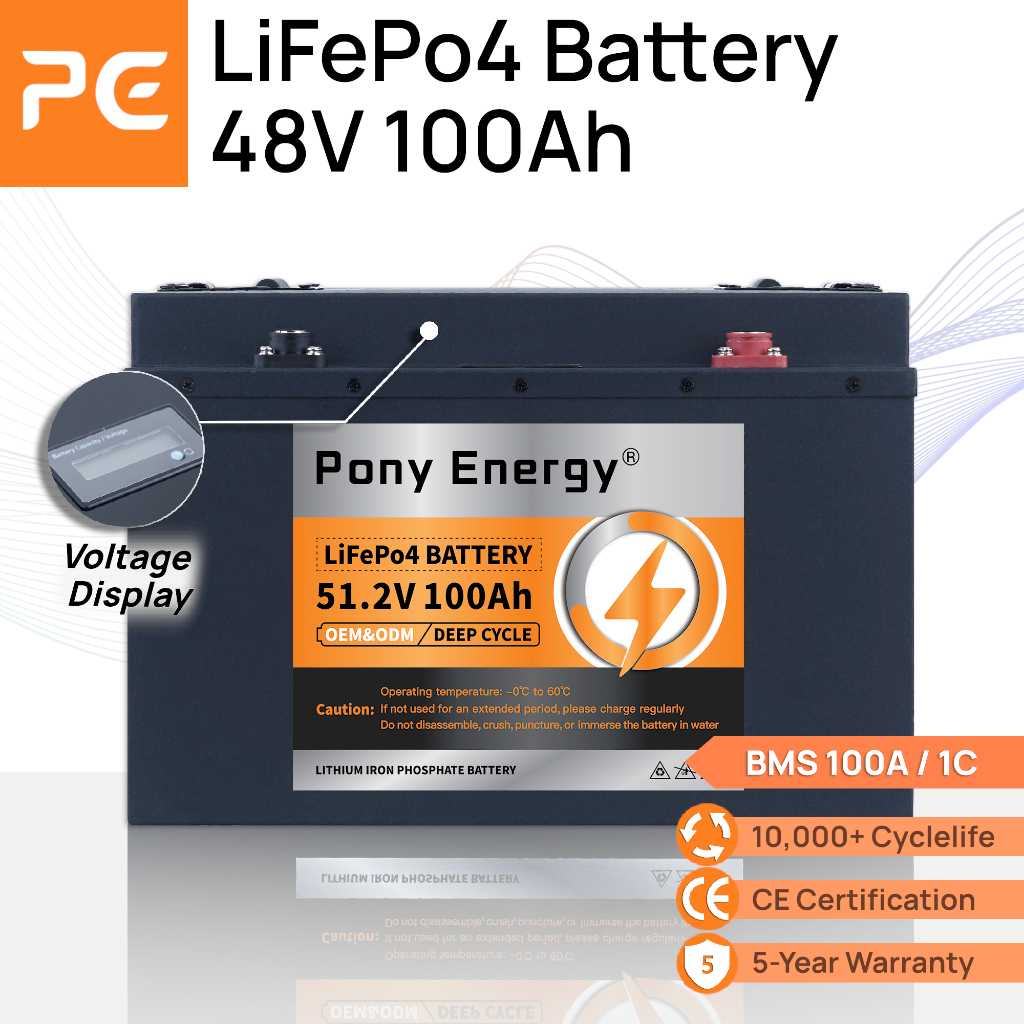 PonyEnergy 48V 100Ah LiFePo4 Battery, 5120Wh with Volt Display & BMS(100A), Stainless Steel Case