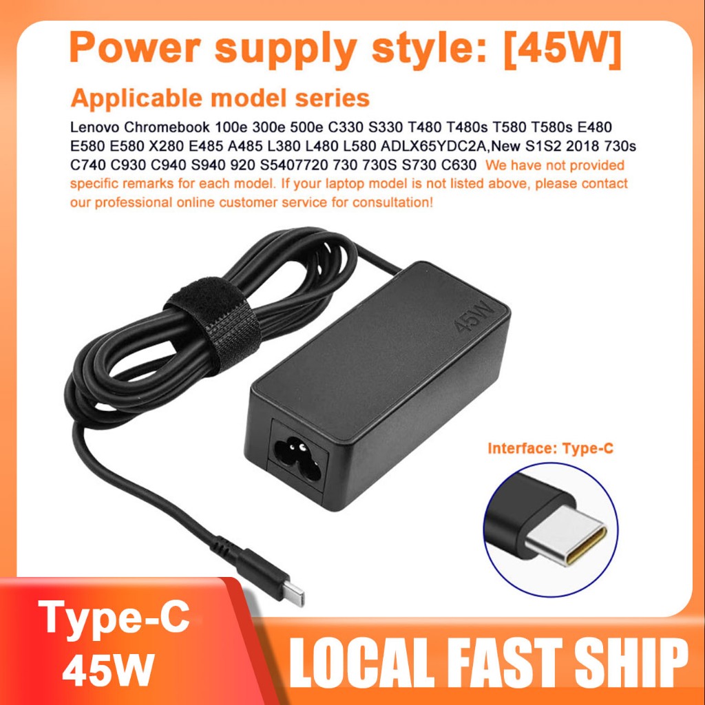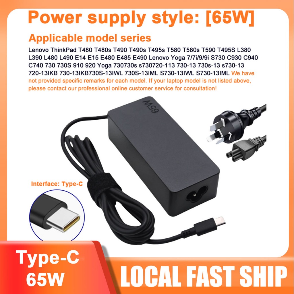 65W Lenovo Laptop Charger USB-C Type-C Adapter - Compatible with ThinkPad, Chromebook & Other Series
