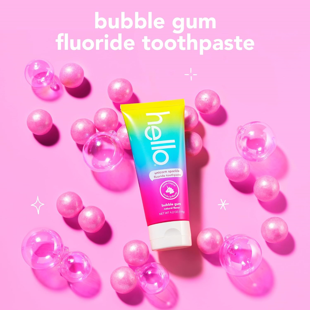 hello Unicorn Sparkle Kids Fluoride Toothpaste, Bubble Gum Natural Flavor, Prevents Cavities 119g