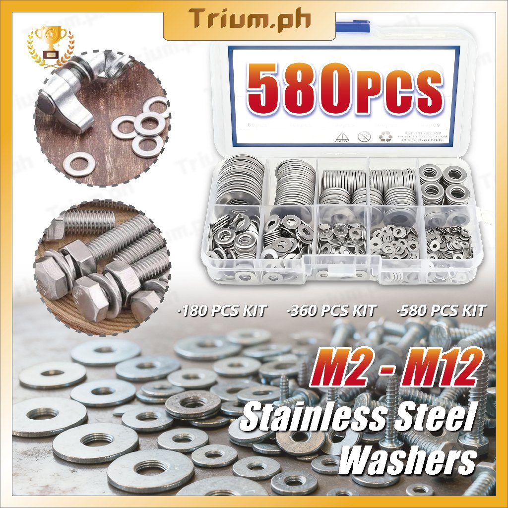 580pcs/Kit M2-M12 Stainless Steel Flat Washer Plain Washer Flat 304 Gasket Ring 180/360/580pcs Set