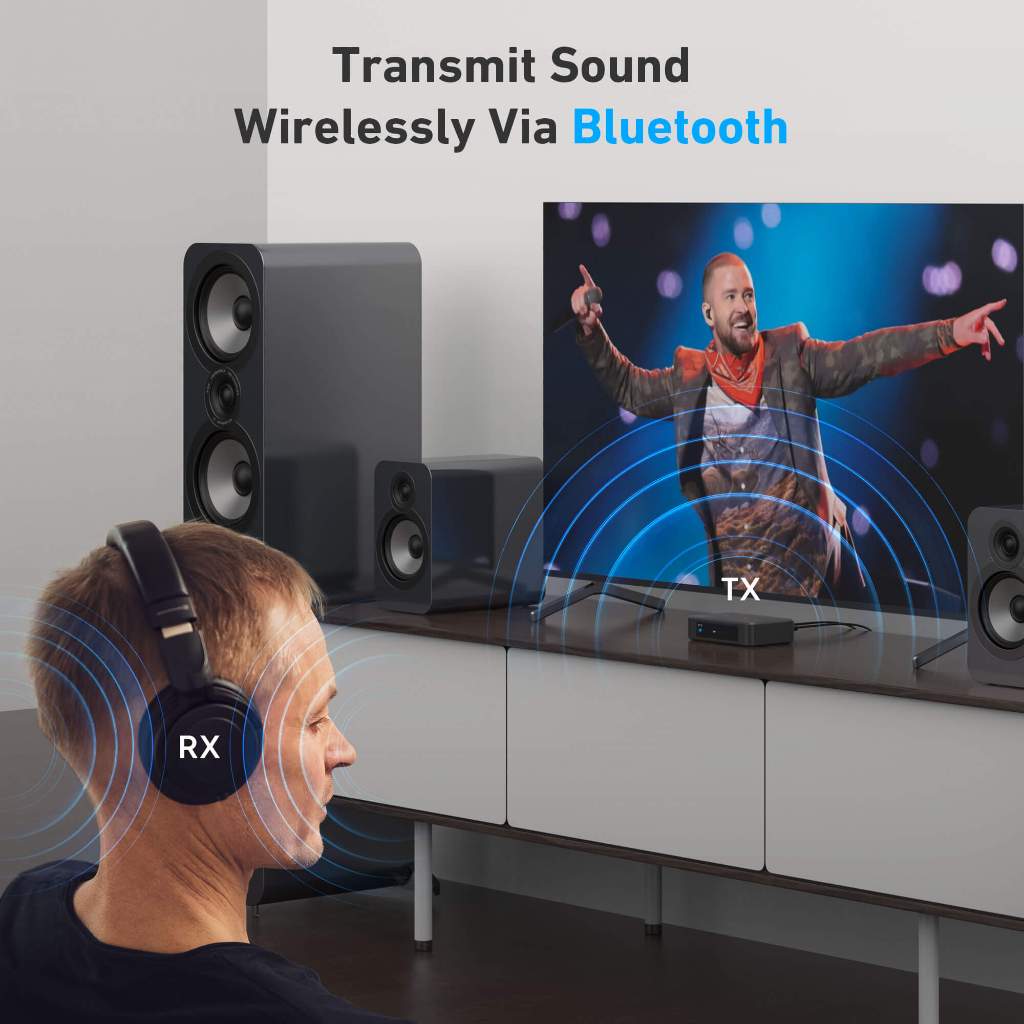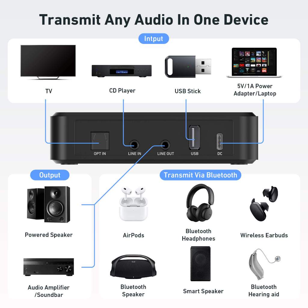 Arylic BT10 Bluetooth audio transmitter transmits audio to headphones or speakers via Bluetooth