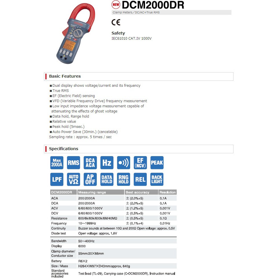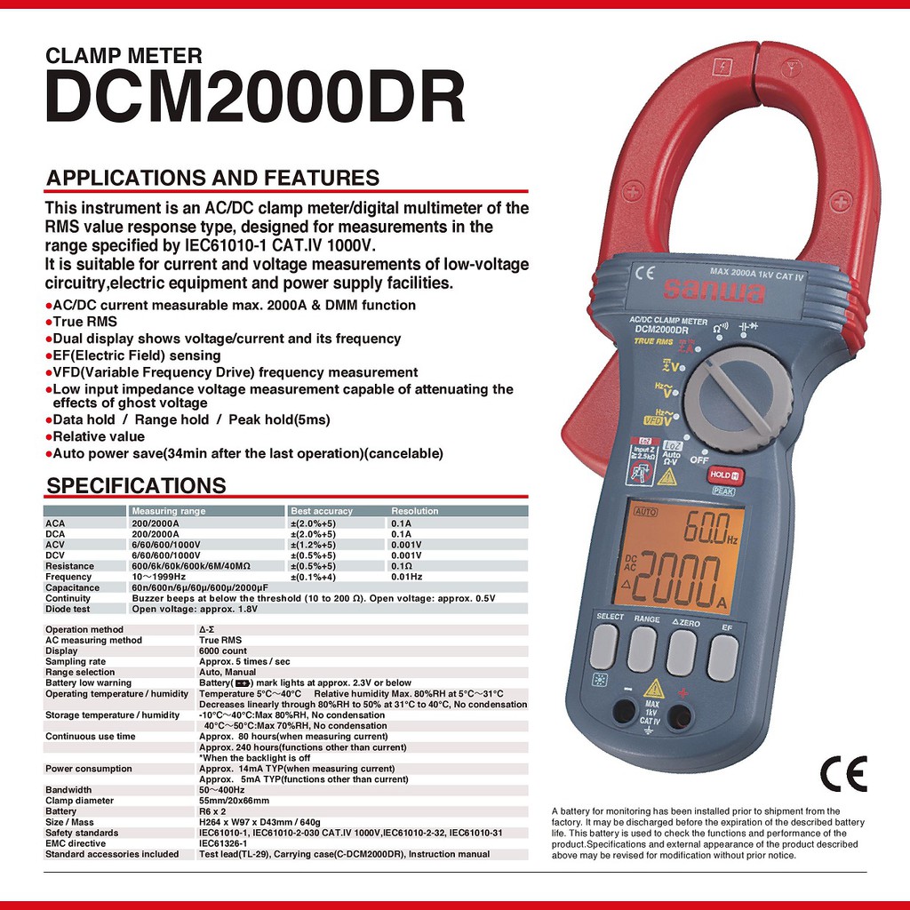 Sanwa DCM2000DR Digital Clamp Meter DC/AC current measurable max. 2000A, CAT.IV 1000V
