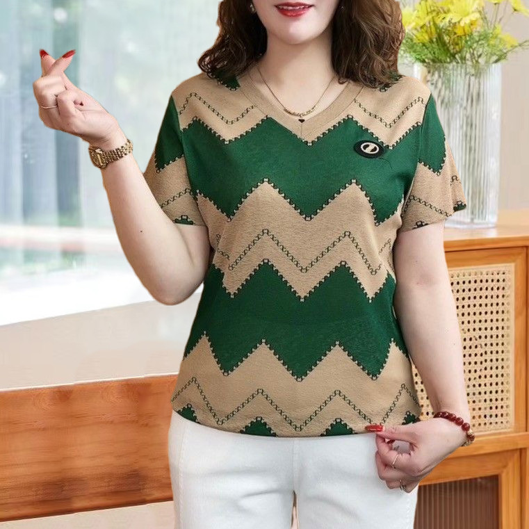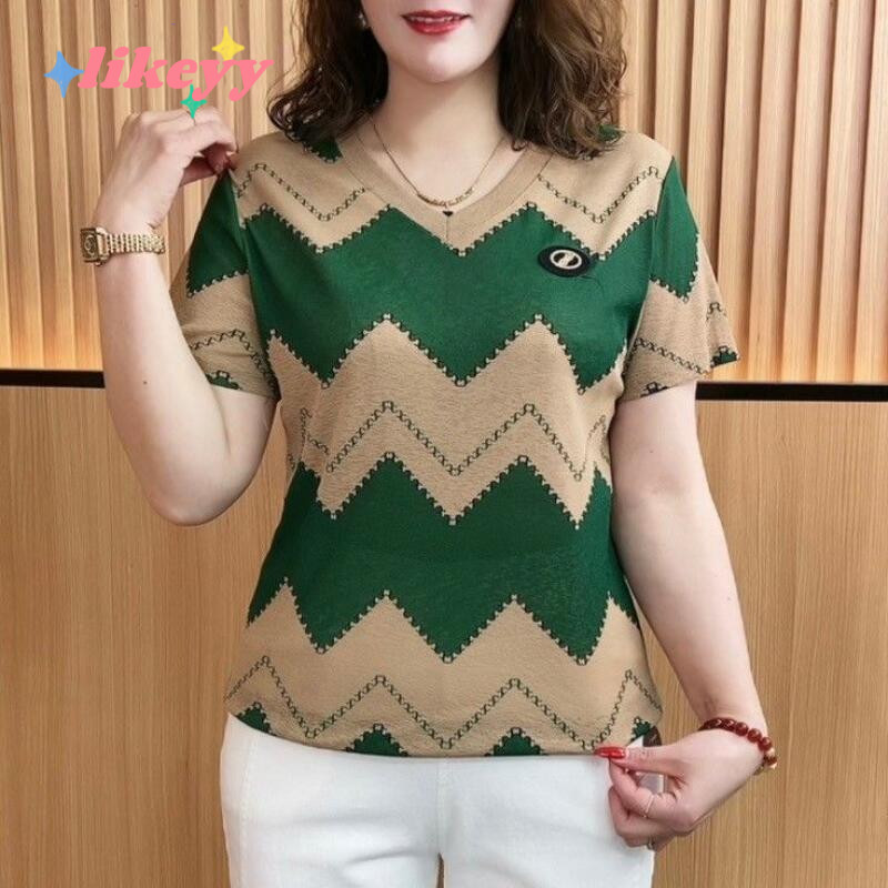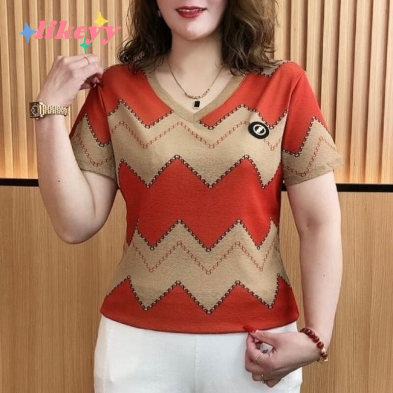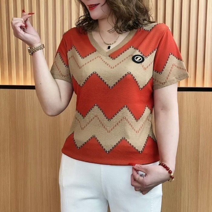 Women Korean Fashion Printed Short Sleeve T-shirt for Female Summer New Clothing All-match Casual V Neck Tops Pullovers