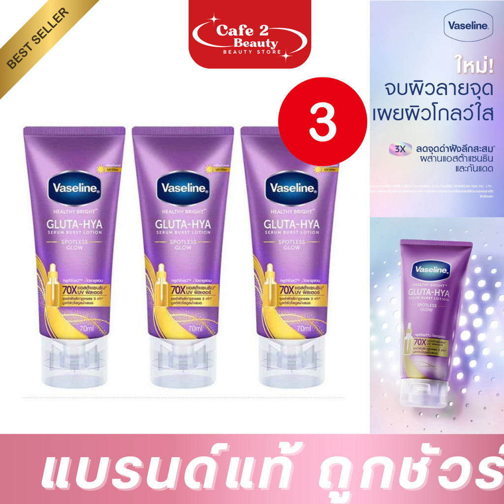 (3 Tubes 70 Mm.) Vaseline Healthy Bright Gluta-Hya Serum Burst Lotion Spotless Glow 70 Ml.