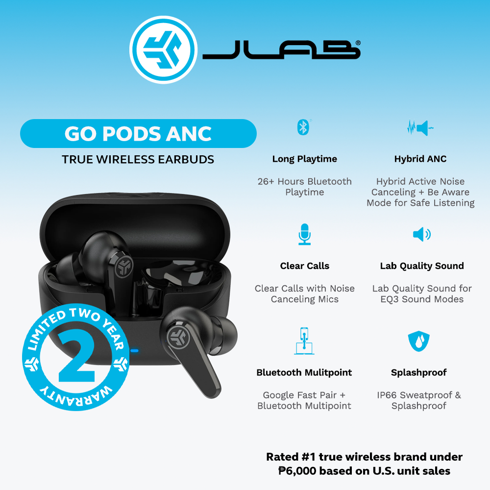 JLab Go Pods ANC True Wireless Bluetooth Earbuds & Charging Case, Black, Hybrid ANC