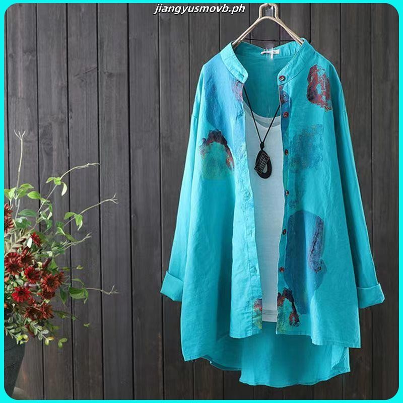 S-4XLLong Women Blouse Plus Size Loose Cotton Linen Blouse Chinese Blouse Stand Collar Tops Blouse Pregnant Long Sleeve Shirts